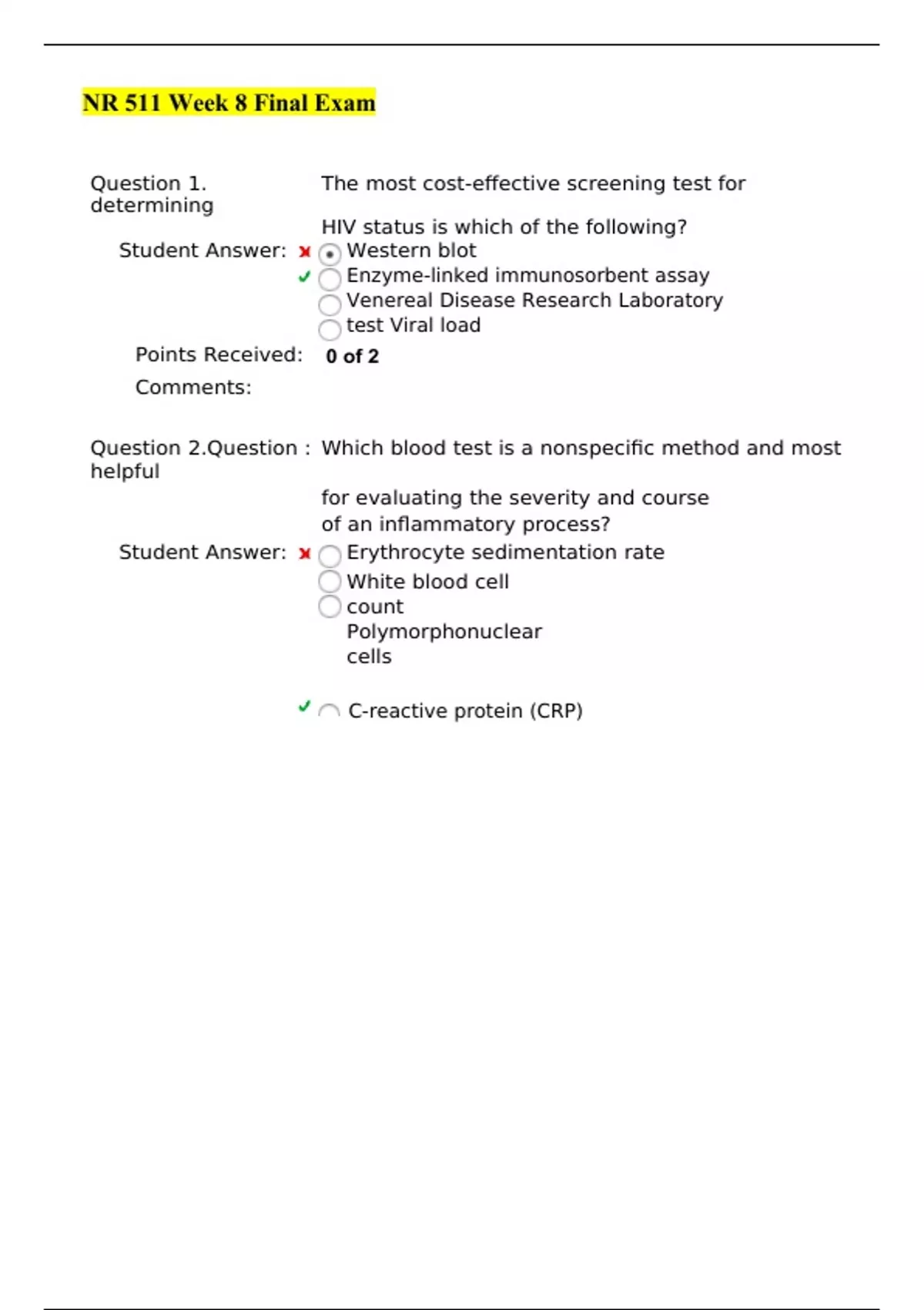NR 511 Week 8 Final Exam Question 1. The most cost-effective screening test for determining HIV status is which of the following? Student Answer: Western blot Enzyme-linked immunosorbent assay Venereal Disease Research Laboratory test Viral load Points Received: 0 of 2 Comments: Question 2.Question : Which blood test is a nonspecific method and most helpful for evaluating the severity and course of an inflammatory process? Student Answer: Erythrocyte sedimentation rate White blood cell count Polymorphonuclear cells C-reactive protein (CRP) Points Received: 0 of 2 Comments: Question 3.Question : Cocaine acts as a stimulant by blocking the reuptake of which neurotransmitter? Student Answer: GABA Acetylcholine Dopamine Serotonin Points Received: 0 of 2 Comments: Question 4.Question : Mrs. Thomas was seen in the office complaining of pain and point tenderness in the area of her elbow. The pain has increased following a day of gardening one week ago. A physical finding that differentiates the diagnosis and is most consistent with lateral epicondylitis (tennis elbow) is: Student Answer: Ecchymosis, edema, and erythema over the lateral epicondyle Pain at the elbow with resisted movements at the wrist and forearm Inability to supinate and pronate the arm Inability to flex or extend the elbow against resistance Points Received: 2 of 2 Comments: Question 5.Question : Which of the following statements concerning the musculoskeletal examination is true? Student Answer: The uninvolved side should be examined initially and then compared to the involved side. The part of the body that is causing the patient pain should be examined first. When possible, the patient should not be asked to perform active range-of-motion (ROM) exercises to avoid causing pain. Radiographs should always be obtained prior to examination so as not to cause further injury to the patient. Points Received: (not graded) Comments: Question 6.Question : Which of the following signs or symptoms indicate an inflammatory etiology to musculoskeletal pain? Student Answer: Decreased C-reactive protein Hyperalbuminemia Morning stiffness Weight gain Points Received: (not graded) Comments: Question 7.Question : Which causes the greatest percentage of mammalian bites? Student Answer: Dogs Cats Humans Rodents Points Received: (not graded) Comments: Question 8.Question : A 48-year-old woman is seen in the clinic with complaints of prolonged heavy menstrual periods. She is pale and states she can no longer exercise. Pelvic exam reveals a single, very large mass. Which of the following diagnostic tests should the clinician order first? Student Answer: Transvaginal ultrasound Endometrial biopsy MRI Abdominal computed tomography scan Points Received: (not graded) Comments: Question 9.Question : A diabetic patient asks the clinician why he needs to check his blood sugar at home even when he feels good. Which of the following responses would be most appropriate? Student Answer: "Control of glucose will help postpone or delay complications." "Regularly checking blood sugar will help establish a routine." "Monitoring glucose will promote a sense of control." All of the above Points Received: (not graded) Comments: Question 10.Question : A 25-year-old patient pre