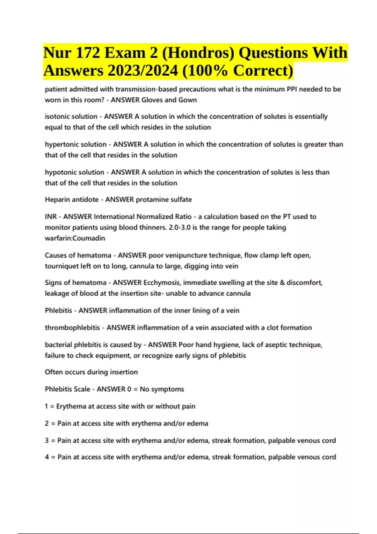 NUR 172 Exam 2 (Hondros) Questions With Answers 2023/2024 (100% Correct). patient admitted with transmission-based precautions what is the minimum PPI needed to be worn in this room? - ANSWER Gloves and Gown isotonic solution - ANSWER A solution in which the concentration of solutes is essentially equal to that of the cell which resides in the solution hypertonic solution - ANSWER A solution in which the concentration of solutes is greater than that of the cell that resides in the solution hypotonic solution - ANSWER A solution in which the concentration of solutes is less than that of the cell that resides in the solution Heparin antidote - ANSWER protamine sulfate INR - ANSWER International Normalized Ratio - a calculation based on the PT used to monitor patients using blood thinners. 2.0-3.0 is the range for people taking warfarin:Coumadin Causes of hematoma - ANSWER poor venipuncture technique, flow clamp left open, tourniquet left on to long, cannula to large, digging into vein Signs of hematoma - ANSWER Ecchymosis, immediate swelling at the site & discomfort, leakage of blood at the insertion site- unable to advance cannula Phlebitis - ANSWER inflammation of the inner lining of a vein thrombophlebitis - ANSWER inflammation of a vein associated with a clot formation bacterial phlebitis is caused by - ANSWER Poor hand hygiene, lack of aseptic technique, failure to check equipment, or recognize early signs of phlebitis Often occurs during insertion Phlebitis Scale - ANSWER 0 = No symptoms 1 = Erythema at access site with or without pain 2 = Pain at access site with erythema and/or edema 3 = Pain at access site with erythema and/or edema, streak formation, palpable venous cord 4 = Pain at access site with erythema and/or edema, streak formation, palpable venous cord Nur 172 Exam 2 (Hondros) Questions With Answers 2023/2024 (100% Correct) >1 inch in length, and purulent drainage erythema - ANSWER redness of the skin Infiltration - ANSWER admission of a non-vesicant med or solution into the surrounding tissue Extravasation - ANSWER admission of a vesicant into surrounding tissue CVAD - ANSWER central vascular access device or indwelling line treatment of thrombophlebitis - ANSWER complete bed rest avoid massage heat and elevation promote venous return anticoagulant therapy treatment of phlebitis - ANSWER remove catheter, warm compress, elevate extremity, apply analgesic or anti-inflammatory PRN active immunity - ANSWER immunity produced by exposure to an antigen, as a result of the immune response pt has a saline lock in place but it is not being used, what should be done? - ANSWER call MD to verify it can be removed which medication is most commonly used to clean an occlusion caused by a blood clot - ANSWER Activase- Alterplace Systemic complications of IV therapy - ANSWER Circulatory overload Speed shock Septicemia Allergic reaction Catheter embolism Air embolism BSI what set would vancomyacin IVPB be given in - ANSWER secondary administration set Circulatory overload is a concern for which patient - ANSWER Patients with elevated BUN and creatinine level BUN - ANSWER 10-20 mg/dL Creatinine - ANSWER 0.6-1.2 mg/dL what are the LPN duties when assisting with blood transfusion - ANSWER monitor pt during transfusion X-ray shows tip of PICC is in the jugular vein - ANSWER let RN know of x-ray reading where should broken IV pumps be stored? - ANSWER Return pump to bio-med engineering dept Is it okay to use a sharpie on a plastic IV bag? - ANSWER no, it will seep through Who can insert PICC lines? - ANSWER Specially trained nurses Skin is cool, taunt, edemic, what type of complication may have occurred? - ANSWER Infiltration What steps should be take if BSI is suspected - ANSWER Notify MD What statement about lorazepam would indicate the nurse needs further teaching? - ANSWER Used for nausea Iv was hung by gravity but the tubing was not primed, what action is take by the nurse? - ANSWER place pt in trendelenburg and left side