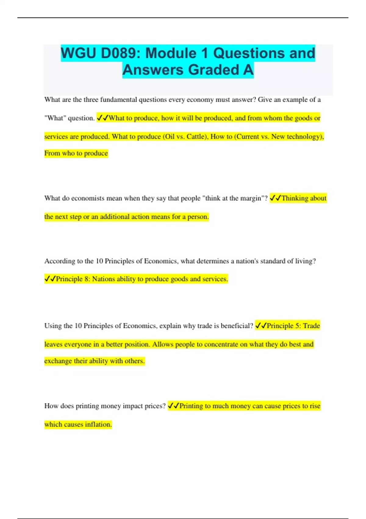 WGU D089: Module 1 Questions and Answers Graded A What are the three fundamental questions every economy must answer? Give an example of a "What" question. What to produce, how it will be produced, and from whom the goods or services are produced. What to produce (Oil vs. Cattle), How to (Current vs. New technology), From who to produce What do economists mean when they say that people "think at the margin"? Thinking about the next step or an additional action means for a person. According to the 10 Principles of Economics, what determines a nation's standard of living? Principle 8: Nations ability to produce goods and services. Using the 10 Principles of Economics, explain why trade is beneficial? Principle 5: Trade leaves everyone in a better position. Allows people to concentrate on what they do best and exchange their ability with others. How does printing money impact prices? Printing to much money can cause prices to rise which causes inflation. Economics Study of how humans make decisions in the face of scarcity. Factors of production Describes the inputs used in the production of goods or services to make an economic profit. Macroeconomics Branch of economics dealing with the performance, structure, behavior, and decision-making of an economy as a whole. Large economic think national or global Microeconomics Branch of economics that studies the behavior of individuals and firms in making decisions regarding the allocation of scarce resources and the interactions among these individuals and firms. think small like people and businesses. Scarcity Basic economic problems, the gap between limited, scarce, resources, and theoretically limitless wants. What to Produce: Using the economy's scarce resources to produce one thing requires giving up another. Every society must decide what it will produce with its scarce resources. opportunity cost The next best alternative that is given up when a choice is made. How to Produce it: There are all sorts of choices to be made in determining how goods and services should be produced. From whom to produce it: If a good or service is produced, a decision must be made about who will get it. The decision if one person, or group or service. Principal 1 Everyone faces tradeoffs- People must decide what they are willing to give up to get what they need or want, For example person wants a new car but will spend most of her check and will forgo other wants or needs. Principal 2 The cost of Something is determined by what you give up to get it - Opportunity cost is the value of the next best alternative. Ex: Buying a new car and the person will give up other goods or services that would have been bought if she didn't purchase the car. Principal 3 Rational people think at the margin- people make better decisions when they consider if the additional benefit, they gain from one more unit is greater than the additional cost of that extra unit of a good or service. Principal 4 People respond to incentives- Most decisions are based on costs Vs. benefits. Principle 5 trade can make everyone better off, allows people to concentrate on what they do best and exchange their ability with others to supplement their own needs Principle 6 Markets are a sound method of organizing economic activity- Principle 7 Governments can sometimes improve market outcomes. This is an exception to rule 6. Principle 8 Standard of living for a nation is determined by its ability to produce goods and services. Relationship between productivity and living standards. Principle 9 Printing to much paper money causes prices to rise, causes inflation. Principle 10 Society faces a short-run trade-off between inflation and unemployment. Ten Principles of Economics What to produce? A property owner has 500 acres of flat land and has been approached by two different businesses. One business want to drill for oil and the other wants to raise cattle How to produce it? A well-established company has been producing goods and wants to create a new line of production. The company needs to decide whether it should use a current factory or find a new location. For whom to Produce? TO address environmental concerns, Congress is considering a bill that would increase the price of electricity generated by coal. Increasing the price of electricity creates a problem for low-income households. Principle 4 of Economics-People respond to incentives Sales manager offers higher commission for product not selling. Principle 5: Trade can leave everyone in a better positon A farmer is really good at growing corn and exchanges the corn for meant and supplies Principle 6: Markets are a sound method of organization economic activity Multiple producers and consumers exchange goods and services Principle 7: Governments sometimes have the ability to better market outcomes Companies face regulations when they create a monopoly in their industry. Consequence of government printing more money Decrease unemployment Economic System refer to how an economy distributes scare resources. Four types of ecconomies Traditional, Command, Market, Mixed Traditional Economy System where individuals make decisions based on traditions, beliefs and customs. command economy Centralized: A system where the government makes all the decisions. Think North Korea market economy Decentralized: System where businesses make decisions based on consumer demand mixed economy System where businesses make decisions based on consumer demand, the government makes decisions in terms of regulations, consumer safety, and the environment. Differences between the Traditional and Market Economy Traditional is based on hunting, fishing, gathering, and agriculture they barter and trade goods and services in place of currency, are centered around tribes or families, exist in a hunter-gather and nomadic society, and produce what is needed. Market is decentralized, production is owned and operated by private individuals or groups, goods and services are supplied on dem