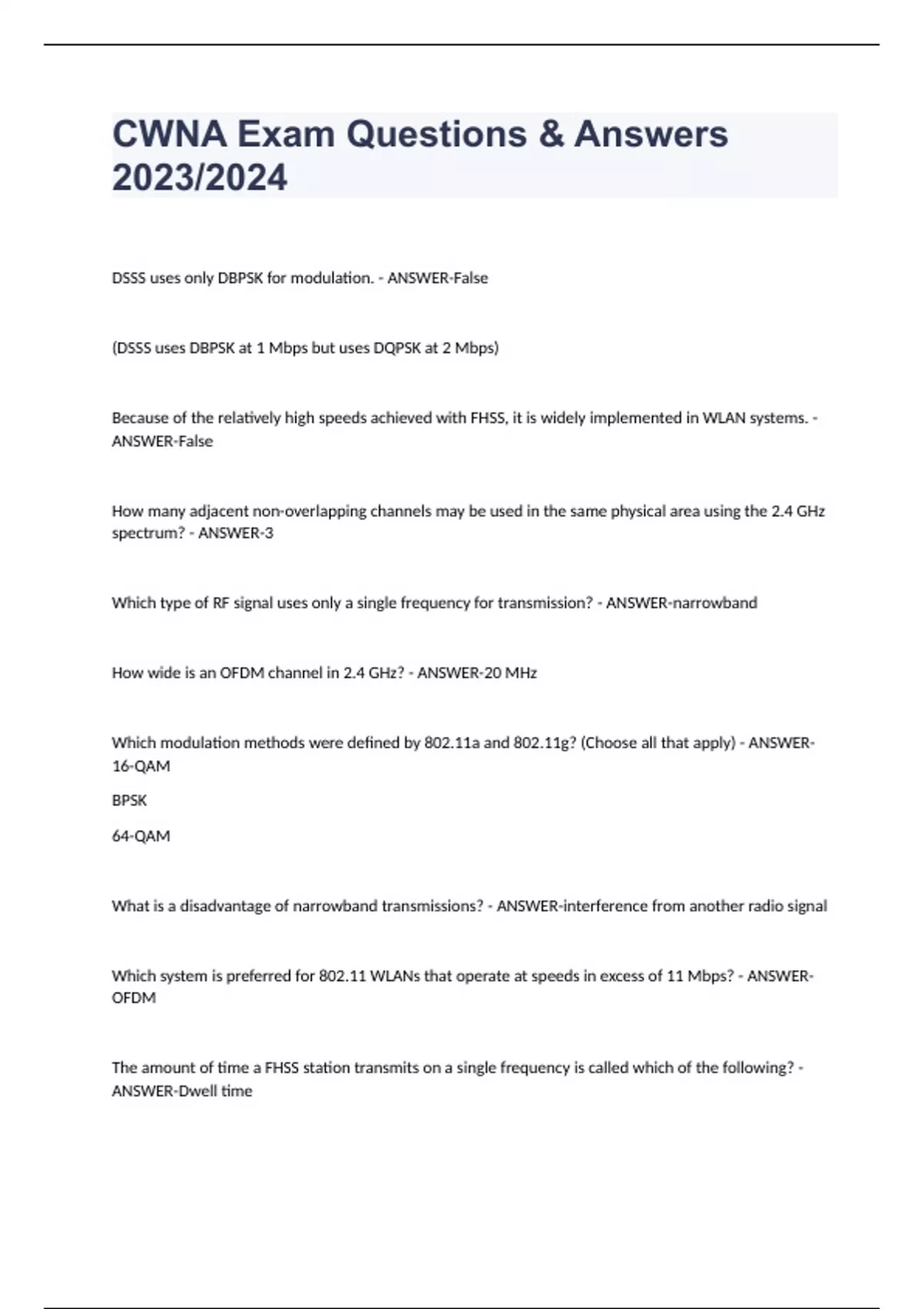 CWNA Exam Questions & Answers 2023/2024 DSSS uses only DBPSK for modulation. - ANSWER-False (DSSS uses DBPSK at 1 Mbps but uses DQPSK at 2 Mbps) Because of the relatively high speeds achieved with FHSS, it is widely implemented in WLAN systems. - ANSWER-False How many adjacent non-overlapping channels may be used in the same physical area using the 2.4 GHz spectrum? - ANSWER-3 Which type of RF signal uses only a single frequency for transmission? - ANSWER-narrowband How wide is an OFDM channel in 2.4 GHz? - ANSWER-20 MHz Which modulation methods were defined by 802.11a and 802.11g? (Choose all that apply) - ANSWER-16-QAM BPSK 64-QAM What is a disadvantage of narrowband transmissions? - ANSWER-interference from another radio signal Which system is preferred for 802.11 WLANs that operate at speeds in excess of 11 Mbps? - ANSWER-OFDM The amount of time a FHSS station transmits on a single frequency is called which of the following? - ANSWER-Dwell time