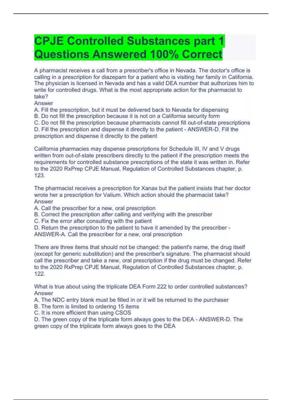 CPJE Controlled Substances part 1 Questions Answered 100% Correct