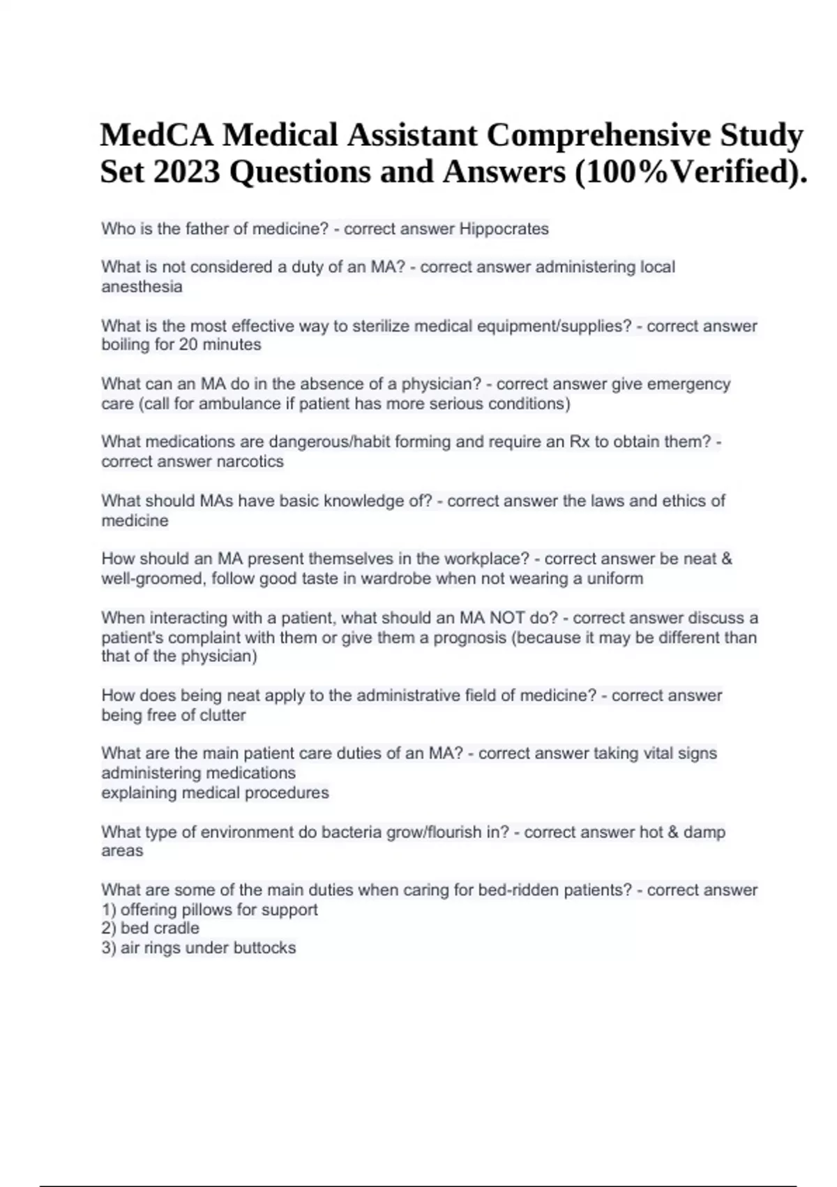 MedCA Medical Assistant Comprehensive Study Set 2023 Questions and Answers (100%Verified). Who is the father of medicine? - correct answer Hippocrates What is not considered a duty of an MA? - correct answer administering local anesthesia What is the most effective way to sterilize medical equipment/supplies? - correct answer boiling for 20 minutes What can an MA do in the absence of a physician? - correct answer give emergency care (call for ambulance if patient has more serious conditions) What medications are dangerous/habit forming and require an Rx to obtain them? - correct answer narcotics What should MAs have basic knowledge of? - correct answer the laws and ethics of medicine How should an MA present themselves in the workplace? - correct answer be neat & well-groomed, follow good taste in wardrobe when not wearing a uniform When interacting with a patient, what should an MA NOT do? - correct answer discuss a patient's complaint with them or give them a prognosis (because it may be different than that of the physician) How does being neat apply to the administrative field of medicine? - correct answer being free of clutter What are the main patient care duties of an MA? - correct answer taking vital signs administering medications explaining medical procedures .