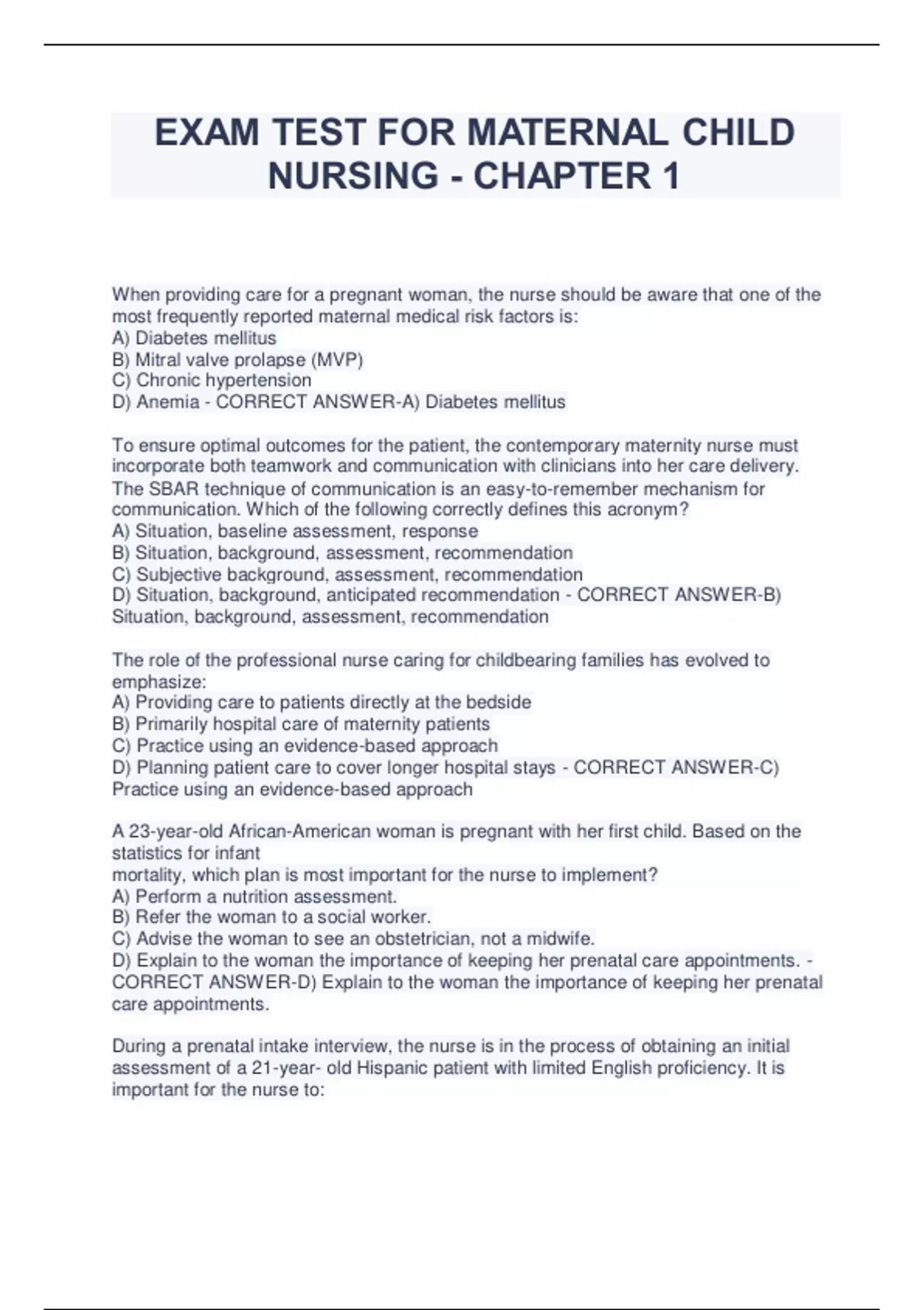 EXAM TEST FOR MATERNAL CHILD NURSING - CHAPTER 1 When providing care for a pregnant woman, the nurse should be aware that one of the most frequently reported maternal medical risk factors is: A) Diabetes mellitus B) Mitral valve prolapse (MVP) C) Chronic hypertension D) Anemia - CORRECT ANSWER-A) Diabetes mellitus To ensure optimal outcomes for the patient, the contemporary maternity nurse must incorporate both teamwork and communication with clinicians into her care delivery. The SBAR technique of communication is an easy-to-remember mechanism for communication. Which of the following correctly defines this acronym? A) Situation, baseline assessment, response B) Situation, background, assessment, recommendation C) Subjective background, assessment, recommendation D) Situation, background, anticipated recommendation - CORRECT ANSWER-B) Situation, background, assessment, recommendation The role of the professional nurse caring for childbearing families has evolved to emphasize: A) Providing care to patients directly at the bedside B) Primarily hospital care of maternity patients C) Practice using an evidence-based approach D) Planning patient care to cover longer hospital stays - CORRECT ANSWER-C) Practice using an evidence-based approach A 23-year-old African-American woman is pregnant with her first child. Based on the statistics for infant mortality, which plan is most important for the nurse to implement? A) Perform a nutrition assessment. B) Refer the woman to a social worker. C) Advise the woman to see an obstetrician, not a midwife. D) Explain to the woman the importance of keeping her prenatal care appointments. - CORRECT ANSWER-D) Explain to the woman the importance of keeping her prenatal care appointments. During a prenatal intake interview, the nurse is in the process of obtaining an initial assessment of a 21-year- old Hispanic patient with limited English proficiency. It is important for the nurse to: A) Use maternity jargon in order for the patient to become familiar with these terms. B) Speak quickly and efficiently to expedite the visit. C) Provide the patient with handouts. D) Assess whether the patient understands the discussion. - CORRECT ANSWER-D) Assess whether the patient understands the discussion. When managing health care for pregnant women at a prenatal clinic, the nurse should recognize that the most significant barrier to access to care is the pregnant woman's: A) Age B) Minority status C) Educational level D) Inability to pay - CORRECT ANSWER-D) Inability to pay What is the primary role of practicing nurses in the research process? A) Designing research studies B) Collecting data for other researchers C) Identifying researchable problems D) Seeking funding to support research studies - CORRECT ANSWER-C) Identifying researchable problems When the nurse is unsure about how to perform a patient care procedure, the best action would be to: A) Ask another nurse. B) Discuss the procedure with the patients physician. C) Look up the procedure in a nursing textbook. D) Consult the agency procedure manual and follow the guidelines for the procedure. - CORRECT ANSWER-D) Consult the agency procedure manual and follow the guidelines for the procedure From the nurses perspective, what measure should be the focus of the health care system to reduce the rate of infant mortality further? A) Implementing programs to ensure women's early participation in ongoing prenatal care B) Increasing the length of stay in a hospital after vaginal birth from 2 to 3 days C) Expanding the number of neonatal intensive care units (NICUs) D) Mandating that all pregnant women receive care from an obstetrician - CORRECT ANSWER-A) Implementing programs to ensure women's early participation in ongoing prenatal care Alternative and complementary therapies: A) Replace conventional Western modalities of treatment. B) Are used by only a small number of American adults. C) Recognize the value of clients input into their health care. D) Focus primarily on the disease an individual is experiencing. - CORRECT ANSWERC) Recognize the value of clients input into their health care A 38-year-old Hispanic woman delivered a 9-pound, 6-ounce girl vaginally after being in labor for 43 hours. The baby died 3 days later from sepsis. On what grounds would the woman potentially have a legitimate legal case for negligence? A) She is Hispanic B) She delivered a girl C) The standards of care were not met D) She refused fetal monitoring - CORRECT ANSWER-C) The standards of care were not met A newly graduated nurse is attempting to understand the reason for increasing health care spending in the United States. Her research finds that these costs are much higher compared with other developed countries as a result of: A) A higher rate of obesity among pregnant women. B) Limited access to technology. C) Increased usage of health care services along with lower prices. D) Homogeneity of the population. - CORRECT ANSWER-A) A higher rate of obesity among pregnant women The term used to describe legal and professional responsibility for practice for maternity nurses is: A) Collegiality B) Ethics C) Evaluation D) Accountability - CORRECT ANSWER-D) Accountability Through the use of social media technology, nurses can link with other nurses who may share similar interests, insights about practice, and advocate for patients. The most concerning pitfall for nurses using this technology is: A) Violation of patient privacy and confidentiality. B) Institutions and colleagues may be cast in an unfavorable light. C) Unintended negative consequences for using social media. D) Lack of institutional policy governing online contact. - CORRECT ANSWER-A) Violation of patient privacy and confidentiality. An important development that affects maternity nursing is integrative health care, which: A) Seeks to provide the same health care for all racial and ethnic groups. B) Blends complementary and alternative therapies with conventional Western treatm