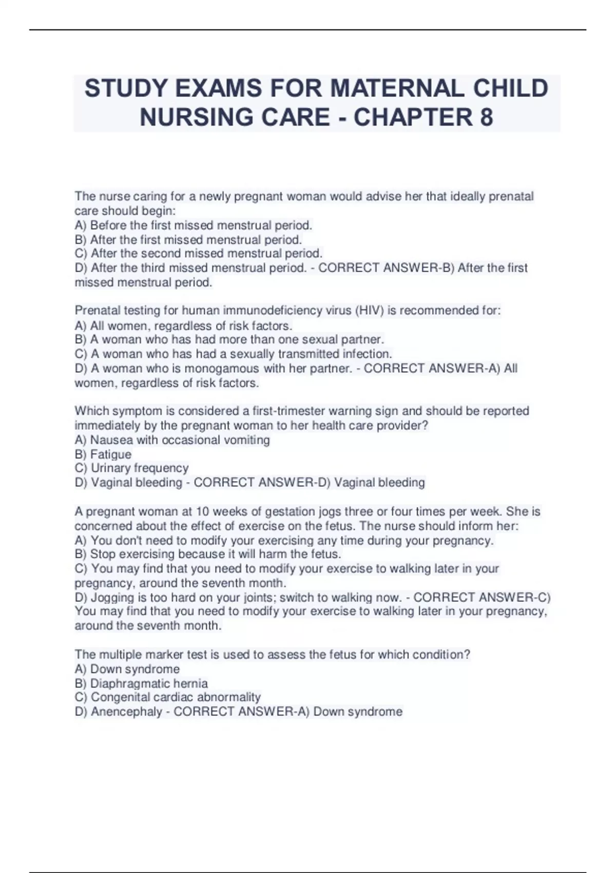 STUDY EXAMS FOR MATERNAL CHILD NURSING CARE - CHAPTER 8 The nurse caring for a newly pregnant woman would advise her that ideally prenatal care should begin: A) Before the first missed menstrual period. B) After the first missed menstrual period. C) After the second missed menstrual period. D) After the third missed menstrual period. - CORRECT ANSWER-B) After the first missed menstrual period. Prenatal testing for human immunodeficiency virus (HIV) is recommended for: A) All women, regardless of risk factors. B) A woman who has had more than one sexual partner. C) A woman who has had a sexually transmitted infection. D) A woman who is monogamous with her partner. - CORRECT ANSWER-A) All women, regardless of risk factors. Which symptom is considered a first-trimester warning sign and should be reported immediately by the pregnant woman to her health care provider? A) Nausea with occasional vomiting B) Fatigue C) Urinary frequency D) Vaginal bleeding - CORRECT ANSWER-D) Vaginal bleeding A pregnant woman at 10 weeks of gestation jogs three or four times per week. She is concerned about the effect of exercise on the fetus. The nurse should inform her: A) You don't need to modify your exercising any time during your pregnancy. B) Stop exercising because it will harm the fetus. C) You may find that you need to modify your exercise to walking later in your pregnancy, around the seventh month. D) Jogging is too hard on your joints; switch to walking now. - CORRECT ANSWER-C) You may find that you need to modify your exercise to walking later in your pregnancy, around the seventh month. The multiple marker test is used to assess the fetus for which condition? A) Down syndrome B) Diaphragmatic hernia C) Congenital cardiac abnormality D) Anencephaly - CORRECT ANSWER-A) Down syndrome A woman who is 32 weeks pregnant is informed by the nurse that a danger sign of pregnancy could be: A) Constipation. B) Alteration in the pattern of fetal movement. C) Heart palpitations. D) Edema in the ankles and feet at the end of the day. - CORRECT ANSWER-B) Alteration in the pattern of fetal movement. A woman who is 14 weeks pregnant tells the nurse that she always had a glass of wine with dinner before she became pregnant. She has abstained during her first trimester and would like to know if it is safe for her to have a drink with dinner now. The nurse would tell her: A) Since you're in your second trimester, there's no problem with having one drink with dinner. B) One drink every night is too much. One drink three times a week should be fine. C) Since you're in your second trimester, you can drink as much as you like. D) Because no one knows how much or how little alcohol it takes to cause fetal problems, the best course is to abstain throughout your pregnancy. - CORRECT ANSWER-D) Because no one knows how much or how little alcohol it takes to cause fetal problems, the best course is to abstain throughout your pregnancy. A pregnant woman at 18 weeks of gestation calls the clinic to report that she has been experiencing occasional backaches of mild-to-moderate intensity. The nurse would recommend that she: A) Do Kegel exercises B) Do pelvic rock exercises C) Use a softer mattress D) Stay in bed for 24 hours - CORRECT ANSWER-B) Do pelvic rock exercises For what reason would breastfeeding be contraindicated? A) Hepatitis B B) Everted nipples C) History of breast cancer 3 years ago D) Human immunodeficiency virus (HIV) positive - CORRECT ANSWER-D) Human immunodeficiency virus (HIV) positive A woman is 3 months pregnant. At her prenatal visit, she tells the nurse that she doesn't know what is happening; one minute shes happy that she is pregnant, and the next minute she cries for no reason. Which response by the nurse is most appropriate? A) Don't worry about it; you'll feel better in a month or so. B) Have you talked to your husband about how you feel? C) Perhaps you really don't want to be pregnant. D) Hormonal changes during pregnancy commonly result in mood swings. - CORRECT ANSWER-D) Hormonal changes during pregnancy commonly result in mood swings. The nurse should be aware that the partners main role in pregnancy is to: A) Provide financial support. B) Protect the pregnant woman from old wives tales. C) Support and nurture the pregnant woman. D) Make sure the pregnant woman keeps prenatal appointments. - CORRECT ANSWER-C) Support and nurture the pregnant woman. During the first trimester, a woman can expect which of the following changes in her sexual desire? A) An increase, because of enlarging breasts B) A decrease, because of nausea and fatigue C) No change D) An increase, because of increased levels of female hormones - CORRECT ANSWER-B) A decrease, because of nausea and fatigue Which behavior indicates that a woman is seeking safe passage for herself and her infant? A) She keeps all prenatal appointments B) She eats for two C) She drives her car slowly D) She wears only low-heeled shoes - CORRECT ANSWER-A) She keeps all prenatal appointments A 3-year-old girls mother is 6 months pregnant. What concern is this child likely to verbalize? A) How the baby will get out B) What the baby will eat C) Whether her mother will die D) What color eyes the baby has - CORRECT ANSWER-B) What the baby will eat In her work with pregnant women of various cultures, a nurse practitioner has observed various practices that seemed strange or unusual. She has learned that cultural rituals and practices during pregnancy seem to have one purpose in common. Which statement best describes that purpose? A) To promote family unity B) To ward off the evil eye C) To appease the gods of fertility D) To protect the mother and fetus during pregnancy - CORRECT ANSWER-D) To protect the mother and fetus during pregnancy What type of cultural concern is the most likely deterrent to many women seeking prenatal care? A) Religion B) Modesty C) Ignorance