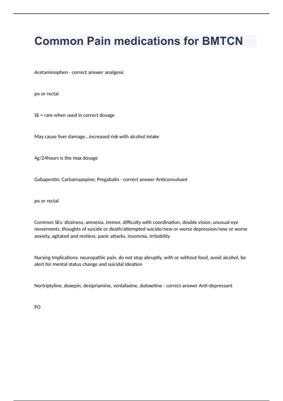 Common Pain medications for BMTCN Acetaminophen - correct answer analgesic po or rectal SE = rare when used in correct dosage May cause liver damage...increased risk with alcohol intake 4g/24hours is the max dosage Gabapentin; Carbamazepine; Pregabalin - correct answer Anticonvulsant po or rectal Common SEs: dizziness, amnesia, tremor, difficulty with coordination, double vision, unusual eye movements, thoughts of suicide or death/attempted suicide/new or worse depression/new or worse anxiety, agitated and restless, panic attacks, insomnia, irritability Nursing Implications: neuropathic pain, do not stop abruptly, with or without food, avoid alcohol, be alert for mental status change and suicidal ideation Nortriptyline, doxepin, desipriamine, venlafaxine, duloxetine - correct answer Anti-depressant PO Common SEs: serotonin syndrome (mental status changes - agitation, hallucinations, coma), autonomic instability (tachycardia, labile blood pressure, hyperthermia), neuromuscular aberrations (hyper-reflexia, incoordination), GI symptoms (nausea, vomiting, diarrhea) Nursing Implications: neuropathic pain, be alert for changes in metal status/suicidal ideations Etidronate, pamidronate, alendronate, risedronate, zoledronate, ibandronate - correct answer Bisphosphonates PO or IV Common Ses: hypocalcemia, skin rash, bone pain, arrhythmias, upper GI symptoms, esophageal irritation, kidney problems, fever NIs: pain related to bone mets, empty stomach, 4 oz of water, do not take before bed Corticosteroids - correct answer Po, IV, IM, and inhaled Common SEs: localized infections of the mouth and pharynx (Candida albicans/inhaled), suppressed immune system, decreases in bone mineral density, hypokalemia, hyperglycemia NIs: monitor blood sugar and potassium, rinse mouth after inhaled use, watch for increased immunosuppression Clonidine/clonidine hydrochloride - correct answer Epidural Intrathecal Common SEs: sedation, hypotension, postural hypotension, decreased heart rate, rebound hypertension, dry mouth, nausea, confusion, dizziness, somnolence, fever