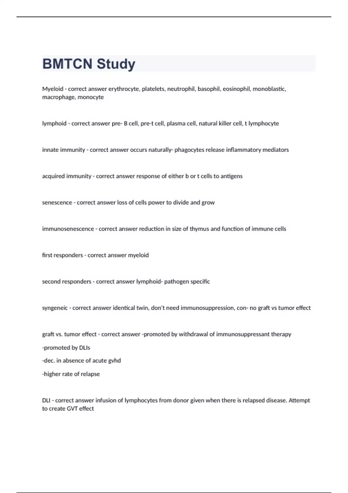 BMTCN StudyMyeloid - correct answer erythrocyte, platelets, neutrophil, basophil, eosinophil, monoblastic, macrophage, monocyte lymphoid - correct answer pre- B cell, pre-t cell, plasma cell, natural killer cell, t lymphocyte innate immunity - correct answer occurs naturally- phagocytes release inflammatory mediators acquired immunity - correct answer response of either b or t cells to antigens senescence - correct answer loss of cells power to divide and grow immunosenescence - correct answer reduction in size of thymus and function of immune cells first responders - correct answer myeloid second responders - correct answer lymphoid- pathogen specific syngeneic - correct answer identical twin, don't need immunosuppression, con- no graft vs tumor effect graft vs. tumor effect - correct answer -promoted by withdrawal of immunosuppressant therapy -promoted by DLIs -dec. in absence of acute gvhd -higher rate of relapse DLI - correct answer infusion of lymphocytes from donor given when there is relapsed disease. Attempt to create GVT effect PBSCT - correct answer - 70 %, - faster engraftment, no anesthesia risks, dec. likelihood of contamination by tumor, -higher risk of gvhd, - but better gvt effect- so dosent make sense for SCD G-CSF - correct answer filgrastim. a glycoprotein stimulates the production of stem cells by binding to certain cell surface areas GM-CSF - correct answer sargramostim. lower stem cell yields. and inc adverse events. similar mechanism of action chemo induced mobilization - correct answer chemo causes reduction in production of blood cells thus stimulating hematapoetic recovery. -cyclophosphamide -paclitaxel -etoposide -cytarabine -improved mobilization -more rapid engraftment -reduced risk of tumor cell contamination chemokine antagonist mobilization - correct answer directly induce mobilization by working as antagonist between the chemokine stromal-derived-factor- 1 and receptor CXCR4. -Plerixafor -often in combination with GCSF red bone marrow - correct answer produces stem cells that create rbcs, whit bcs, and plts. found in long and flat bones yellow bone marrow - correct answer produce stromal stem cells that produce fat, cartilage and bone. found in long bones