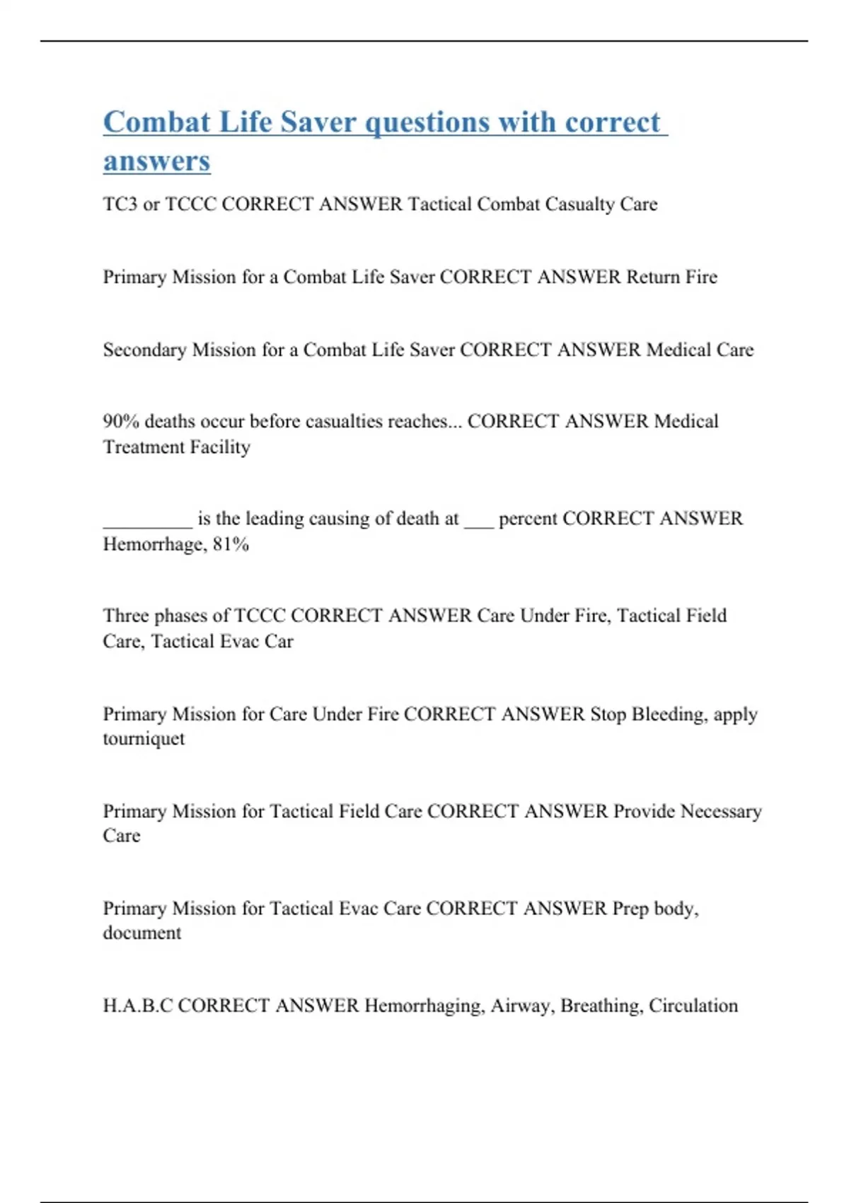 TC3 or TCCC CORRECT ANSWER Tactical Combat Casualty Care Primary Mission for a Combat Life Saver CORRECT ANSWER Return Fire Secondary Mission for a Combat Life Saver CORRECT ANSWER Medical Care 90% deaths occur before casualties reaches... CORRECT ANSWER Medical Treatment Facility _________ is the leading causing of death at ___ percent CORRECT ANSWER Hemorrhage, 81% Three phases of TCCC CORRECT ANSWER Care Under Fire, Tactical Field Care, Tactical Evac Car Primary Mission for Care Under Fire CORRECT ANSWER Stop Bleeding, apply tourniquet Primary Mission for Tactical Field Care CORRECT ANSWER Provide Necessary Care Primary Mission for Tactical Evac Care CORRECT ANSWER Prep body, document H.A.B.C CORRECT ANSWER Hemorrhaging, Airway, Breathing, Circulation