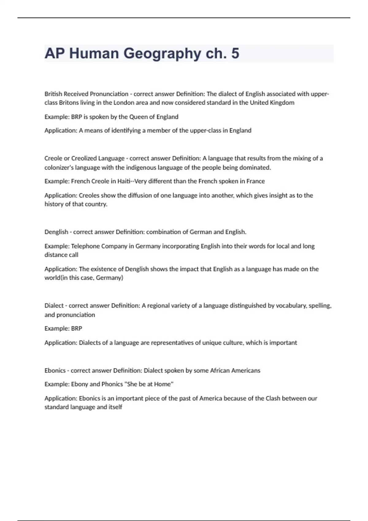 AP Human Geography ch. 5.British Received Pronunciation - correct answer Definition: The dialect of English associated with upper-class Britons living in the London area and now considered standard in the United Kingdom Example: BRP is spoken by the Queen of England Application: A means of identifying a member of the upper-class in England Creole or Creolized Language - correct answer Definition: A language that results from the mixing of a colonizer's language with the indigenous language of the people being dominated. Example: French Creole in Haiti--Very different than the French spoken in France Application: Creoles show the diffusion of one language into another, which gives insight as to the history of that country. Denglish - correct answer Definition: combination of German and English. Example: Telephone Company in Germany incorporating English into their words for local and long distance call Application: The existence of Denglish shows the impact that English as a language has made on the world(in this case, Germany) Dialect - correct answer Definition: A regional variety of a language distinguished by vocabulary, spelling, and pronunciation Example: BRP Application: Dialects of a language are representatives of unique culture, which is important Ebonics - correct answer Definition: Dialect spoken by some African Americans Example: Ebony and Phonics "She be at Home" Application: Ebonics is an important piece of the past of America because of the Clash between our standard language and itself Franglais - correct answer Definition: A term used by the French for English words that have entered the French language, a combination of franfais and anglai." the French words for "French" and "English," respectively. Example: Diffusion of english words such as "jeans", "cowboy", etc into the French Language Application: Franglais is VERY frowned upon--French is all about the purity of the language and the French block out all English so that the language remains pure. Ideograms - correct answer Definition: The system of writing used in China and other East Asian countries in which each symbol represents an idea or concept rather than a specific sound, as is the case with letters in English. Example: 您好老師 (hello teacher) Application: Entirely different from the English alphabet where we have sounds--SOUNDS VS IDEAS Isogloss - correct answer Definition: A boundary that separates regions in which different language usages predominate Example: Ireland and England-Same language, different dialect Application: Isoglosses not only separate dialects, but also cultures. Isolated Language - correct answer Definition: A language that is unrelated to any other languages and therefore not attached to any language family. Example: Japanese Application: An Isolated Language shows unique culture as well as gives insight as to how much interaction it has/had with other countries Language - correct answer Definition: A system of communication through the use of speech, a collection of sounds understood by a group of people to have the same meaning. Example: English Application: Language allows for communication between humans, something necessary for development/progress Language Branch - correct answer Definition: A collection of languages related through a common ancestor that existed several thousand years ago. Differences are not as extensive or old as with language families, and archaeological evidence can confirm that these derived from the same family.