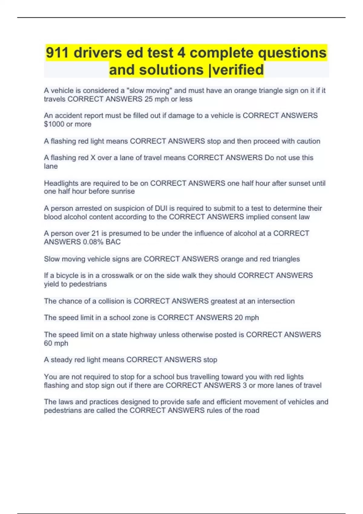 911 drivers ed test 4 complete questions and solutions |verified