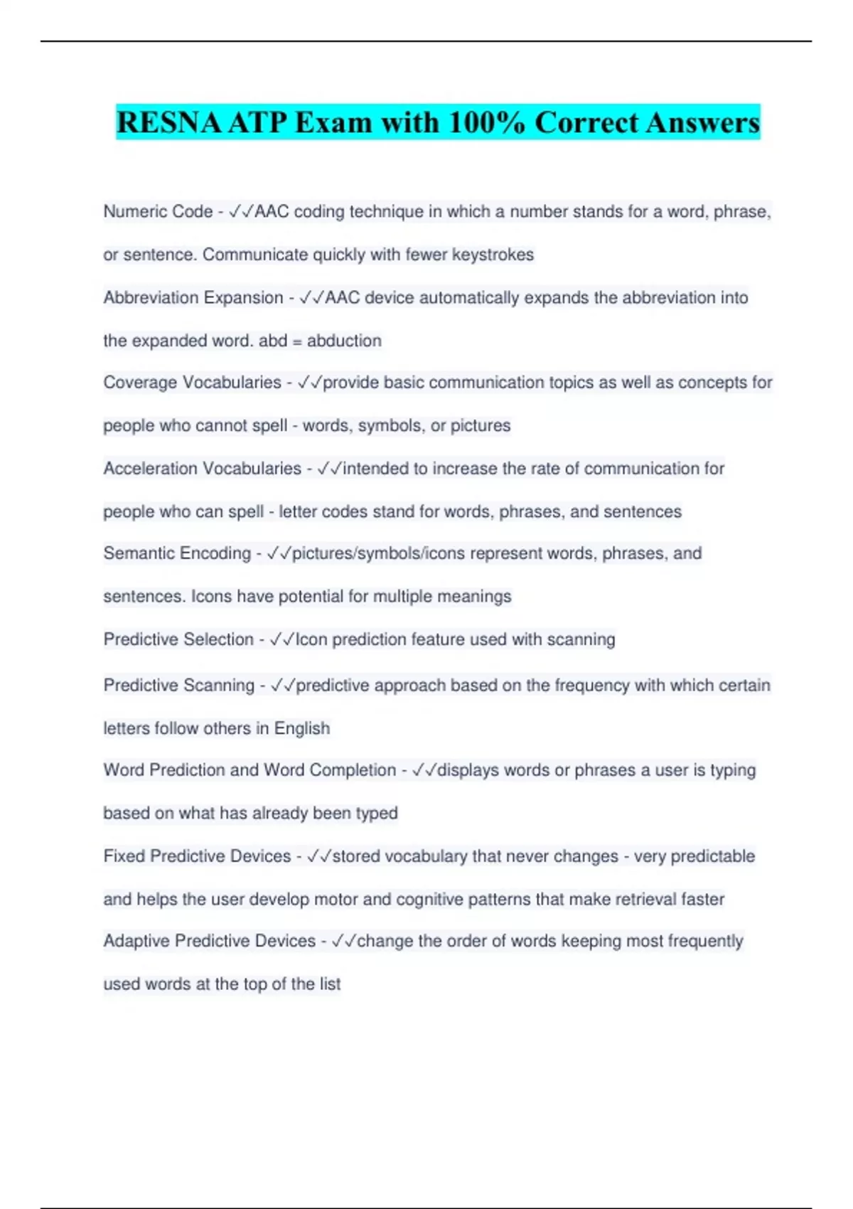 RESNA ATP Exam with 100% Correct Answers Numeric Code - AAC coding technique in which a number stands for a word, phrase, or sentence. Communicate quickly with fewer keystrokes Abbreviation Expansion - AAC device automatically expands the abbreviation into the expanded word. abd = abduction Coverage Vocabularies - provide basic communication topics as well as concepts for people who cannot spell - words, symbols, or pictures Acceleration Vocabularies - intended to increase the rate of communication for people who can spell - letter codes stand for words, phrases, and sentences Semantic Encoding - pictures/symbols/icons represent words, phrases, and sentences. Icons have potential for multiple meanings Predictive Selection - Icon prediction feature used with scanning Predictive Scanning - predictive approach based on the frequency with which certain letters follow others in English Word Prediction and Word Completion - displays words or phrases a user is typing based on what has already been typed Fixed Predictive Devices - stored vocabulary that never changes - very predictable and helps the user develop motor and cognitive patterns that make retrieval faster Adaptive Predictive Devices - change the order of words keeping most frequently used words at the top of the list