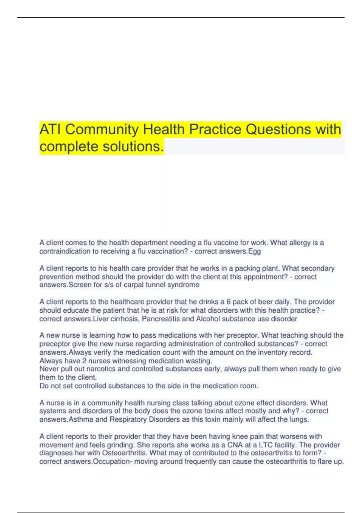 ATI Community Health Practice Questions with complete solutions. A client comes to the health department needing a flu vaccine for work. What allergy is a contraindication to receiving a flu vaccination? - correct answers.Egg A client reports to his health care provider that he works in a packing plant. What secondary prevention method should the provider do with the client at this appointment? - correct answers.Screen for s/s of carpal tunnel syndrome A client reports to the healthcare provider that he drinks a 6 pack of beer daily. The provider should educate the patient that he is at risk for what disorders with this health practice? - correct answers.Liver cirrhosis, Pancreatitis and Alcohol substance use disorder A new nurse is learning how to pass medications with her preceptor. What teaching should the preceptor give the new nurse regarding administration of controlled substances? - correct answers.Always verify the medication count with the amount on the inventory record. Always have 2 nurses witnessing medication wasting. Never pull out narcotics and controlled substances early, always pull them when ready to give them to the client. Do not set controlled substances to the side in the medication room. A nurse is in a community health nursing class talking about ozone effect disorders. What systems and disorders of the body does the ozone toxins affect mostly and why? - correct answers.Asthma and Respiratory Disorders as this toxin mainly will affect the lungs. A client reports to their provider that they have been having knee pain that worsens with movement and feels grinding. She reports she works as a CNA at a LTC facility. The provider diagnoses her with Osteoarthritis. What may of contributed to the osteoarthritis to form? - correct answers.Occupation- moving around frequently can cause the osteoarthritis to flare up. A coal miner wants to know what types of toxins in the works can increase risk of skin cancer. How should the public health nurse respond? - correct answers.Occupational arsenic, coal and nitrates can increase ones risk for developing skin cancer. A nurse who works in the radiology department inquires to the public health nurse about her risk for hypothyroidism based on occupational exposure to radiation. How should the public health nurse respond? - correct answers.Exposure to iodine and radiation increases ones risk for hypothyroidism. You should wear a lead based jacket that covers your to neck to prevent additional radiation exposure when working with patients. A first responder works for several weeks in the days after hurricane Katrina happened to give care to citizens of the city and rescue those from their homes. What phase of the disaster response phases is this responder in? - correct answers.Heroic Several survivors for 9/11 reunite and share their survivor stories after the disaster. What phase of the disaster response phase are these people in? - correct answers.Honeymoon A firefighter reports to their chief in command that they feel burned out having to put out the California fires each day and says that he will be leaving the profession. What stage of the disaster response phase is he in? - correct answers.Disillusionment The city is beginning to rebuild and move on from the disaster from hurricane Irma. What phase of the disaster response phases is this community in? - correct answers.Reconstruction A client comes into the emergency department with signs and symptoms of anthrax. What medication and treatment should the nurse give? - correct answers.Antibiotics such as ciprofloxacin and the anthrax vaccine should be given to all exposed to anthrax and its manifestations A family member of an older adult with dementia questions the nurse about dementia manifestations. What should the nurse tell them regarding the disease process. - correct answers.The client may initially have forgetfulness that will gradually progress to disorientation. A client is reported to have smallpox. How should this communicable disease be treated and what is the time frame? - correct answers.Give immune globulin and antivirals, NOT antibioticswithin 2-3 days of exposure A client was exposed to sarin gas at work. How should the nurse treat this disorder and what is the time frame treatment should be given? - correct answers.Give the medication pralidoxime at the time of the exposure. An older adult client tells the community center nurse that he can no longer drive due to his retinal detachment and cannot use his home stove. What resource should the nurse refer the client to? - correct answers.Meals on Wheels as it will allow the older adult to get meals delivered to his home. A client is admitted with scabies. What precautions will the nurse need to initiate while caring for this client? - correct answers.Private room with gown and gloves. A homeless client walks into the ER from off the street complaining that he hears voices telling him to jump off a bridge and die. What is the first intervention the nurse should do? - correct answers.Initiate suicide safety precautions.