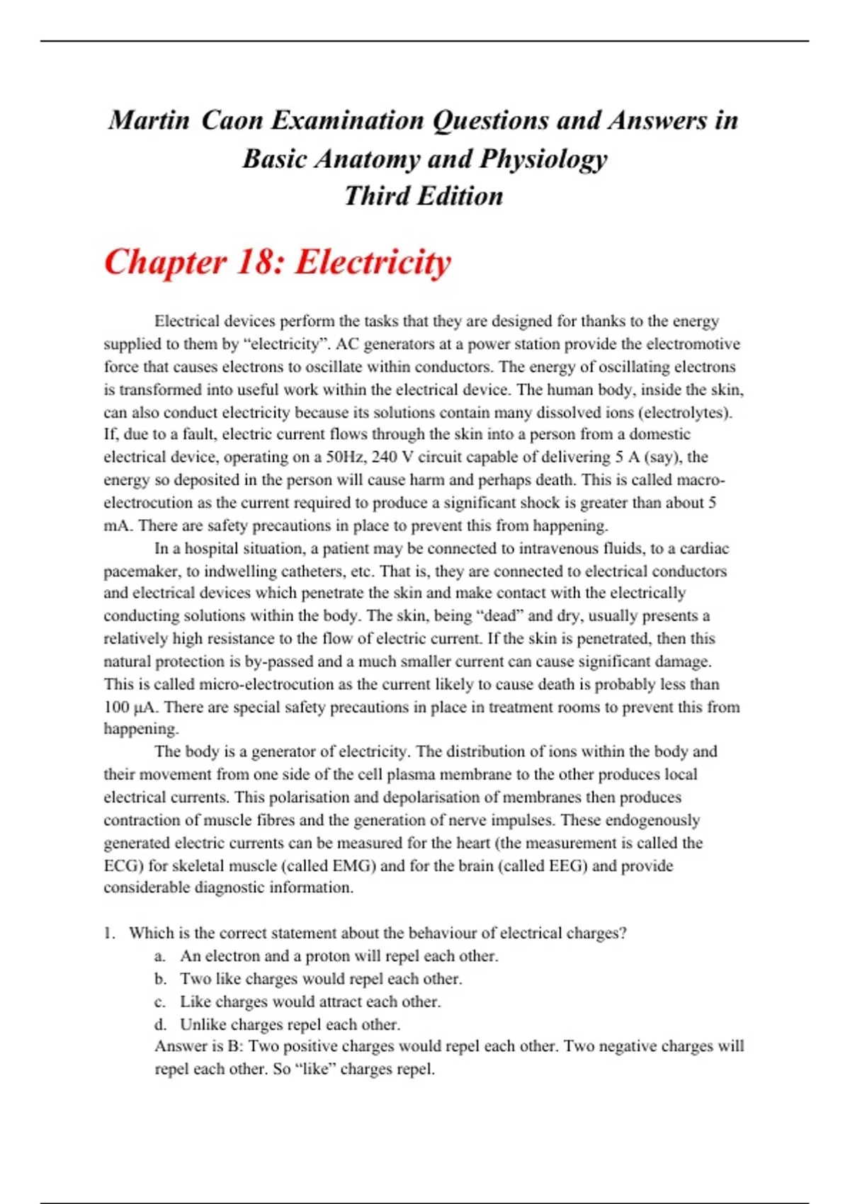 Chapter 18: Electricity Martin Caon Examination Questions and Answers in Basic Anatomy and Physiology Third Edition