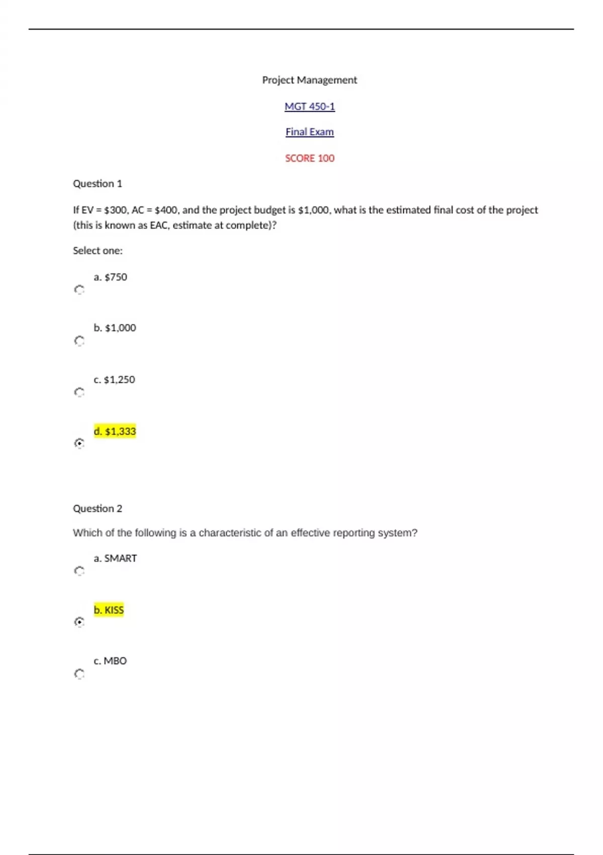 Project Management MGT 450-1 Final Exam SCORE 100||LATEST 2023/2024||QUESTIONS WITH VERIFIED ANSWERS
