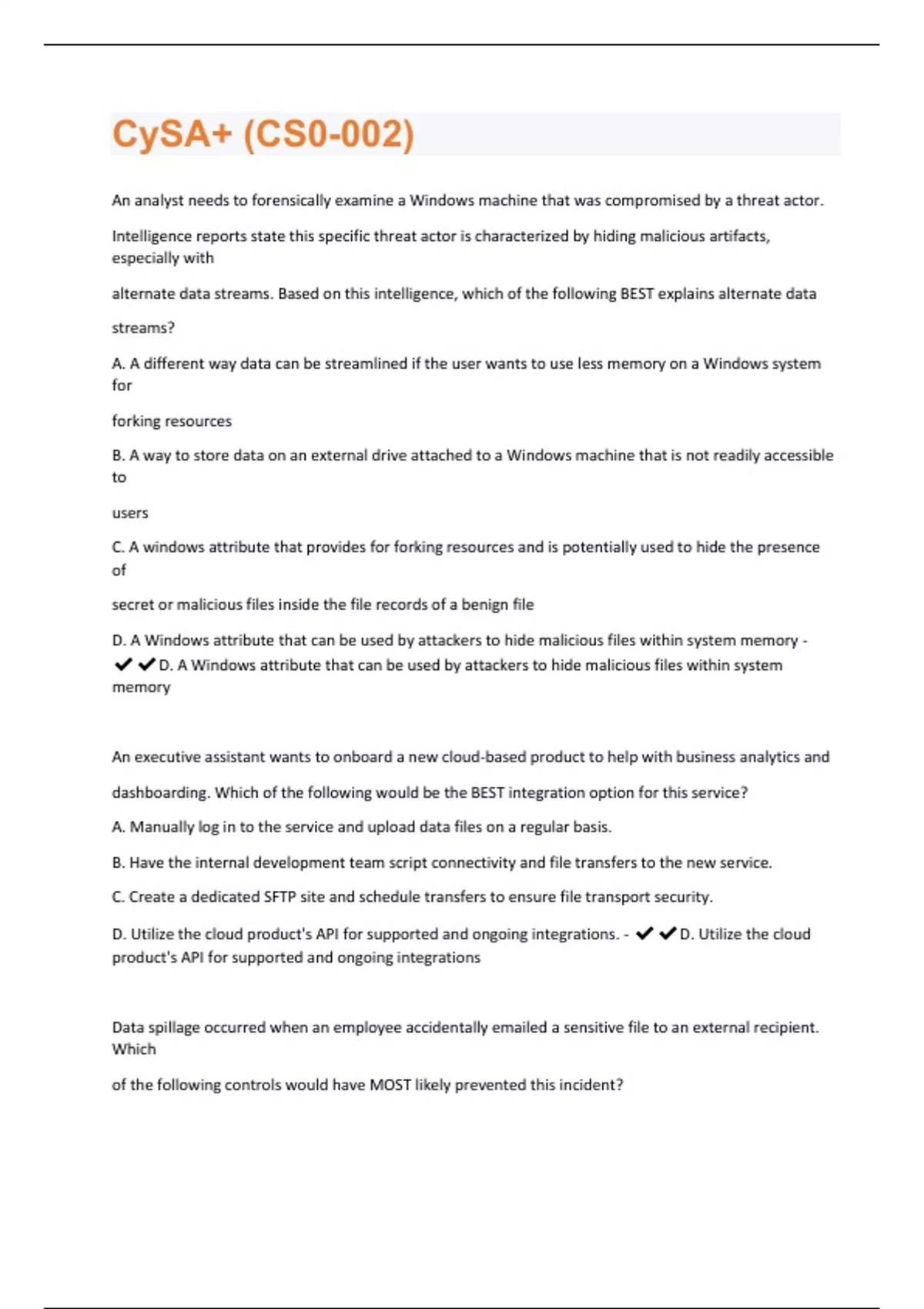 An analyst needs to forensically examine a Windows machine that was compromised by a threat actor. Intelligence reports state this specific threat actor is characterized by hiding malicious artifacts, especially with alternate data streams. Based on this intelligence, which of the following BEST explains alternate data streams? A. A different way data can be streamlined if the user wants to use less memory on a Windows system for forking resources B. A way to store data on an external drive attached to a Windows machine that is not readily accessible to users C. A windows attribute that provides for forking resources and is potentially used to hide the presence of secret or malicious files inside the file records of a benign file D. A Windows attribute that can be used by attackers to hide malicious files within system memory - D. A Windows attribute that can be used by attackers to hide malicious files within system memory An executive assistant wants to onboard a new cloud-based product to help with business analytics and dashboarding. Which of the following would be the BEST integration option for this service? A. Manually log in to the service and upload data files on a regular basis. B. Have the internal development team script connectivity and file transfers to the new service. C. Create a dedicated SFTP site and schedule transfers to ensure file transport security. D. Utilize the cloud product's API for supported and ongoing integrations. - D. Utilize the cloud product's API for supported and ongoing integrations Data spillage occurred when an employee accidentally emailed a sensitive file to an external recipient. Which of the following controls would have MOST likely prevented this incident?A. SSO B. DLP C. WAF D. VDI - B. DLP A development team is testing a new application release. The team needs to import existing client PHI data records from the production environment to the test environment to test accuracy and functionality. Which of the following would BEST protect the sensitivity of this data while still allowing the team to perform the testing? A. Deidentification B. Encoding C. Encryption D. Watermarking - A. Deidentification
