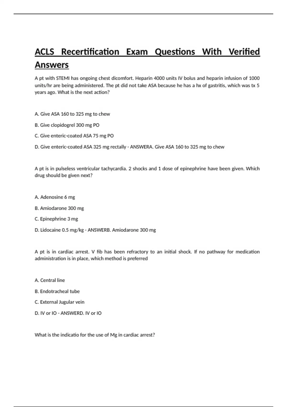 A pt with STEMI has ongoing chest dicomfort. Heparin 4000 units IV bolus and heparin infusion of 1000 units/hr are being administered. The pt did not take ASA because he has a hx of gastritis, which was tx 5 years ago. What is the next action? A. Give ASA 160 to 325 mg to chew B. Give clopidogrel 300 mg PO C. Give enteric-coated ASA 75 mg PO D. Give enteric-coated ASA 325 mg rectally - ANSWERA. Give ASA 160 to 325 mg to chew A pt is in pulseless ventricular tachycardia. 2 shocks and 1 dose of epinephrine have been given. Which drug should be given next? A. Adenosine 6 mg B. Amiodarone 300 mg C. Epinephrine 3 mg D. Lidocaine 0.5 mg/kg - ANSWERB. Amiodarone 300 mg A pt is in cardiac arrest. V fib has been refractory to an initial shock. If no pathway for medication administration is in place, which method is preferred A. Central line B. Endotracheal tube C. External Jugular vein D. IV or IO - ANSWERD. IV or IO What is the indicatio for the use of Mg in cardiac arrest? A. V tach associated with a normal QT interval B. shock-refractory monomorphic v tach C. Pulseless v tach-associated torsades de pointes D. shock-refractory v fib - ANSWERC. Pulseless v tach-associated torsades de pointes You arrive on the scene with the code team. CRP is in progess. An AED previously advised "no shock indicated." A rhythm chec now finds asystole. After resuming compressions, which action do you take next? A. Call for a pulse check B. establish IV or IO access C. Insert a laryneal airway D. Perform endotracheal intubation - ANSWERB. establish IV or IO access A pt is in cardiac arrest. V fib has been refractory to a second shock. Which drug should be administered first? A. Atropine 1 mg IV/IO B. epinephrine 1 mg IV/IO C. Lidocaine 1 mg/kg IV/IO D. Sodium bicarbonate 50 mEq IV/IO - ANSWERB. epinephrine 1 mg IV/IO A pt with sinus bradycardia and a HR of 42/min has diaphoresis and a BP of 80/60 mg. What is the initial dose of atropine? A. 0.1 mg B. 0.5 mg C. 1 mg D. 3 mg - ANSWERB. 0.5 mg A pt is in refractory V fib. CRP is in progess. One dose of epinephrine was given after the second shock. An antiarrhythimic drug was given immediate after the thirst shock. You are the team leader. Which med do you order next? A. Epinephrine 1 mg B. epinephrine 3 mg C. Sodium bicarbonate 50 mEq D. a second dose of the antiarrhythmic drug - ANSWERA. Epinephrine 1 mg A monitored pt in the ICU developed a sudden onset of narrow-complex tachycardia at 220/min. The pt BP is 128/58. The PETCO2 is 38 mm Hg, and the puse Ox is 98%. There is a vascular access in the L arm, and the pt has not been given any vasoactive drugs. An ECG confirms supraventricular tachycardia with no evidence of ischemia or infarction. The HR has not responsed to vagal maneuvers. What is the next action? A. Administer adenosine 6 mg IV push B. Administer amiodarone 300 mg IV push C. perform synchronized cardioversion at 50 J D. perform synchronized cardioversion at 200 J - ANSWERA. Administer adenosine 6 mg IV push A pt has a rapid irregular wide-complex tachycardia. The ventricular rate is 138/min. He is asx with a BP of 110/70. PMHx of angina. What action is recommended next? A. Give adenosine 6 mg IV bolus B. Give lidocaine 1 to 1.5 mg IV bolus C. performing synchronized cardioversion D. Seeking expert consultation - ANSWERD. Seeking expert consultation at 61yoM suddenly experienced difficulty speaking and L sided weakness. HE meet initial criteria for fibrinolytic therapy, and a CT scan of the brain is ordered. Which best describes the guidelines for anti-platelet and fibrinolytic therapy? A. give ASA 160-325 to be chewed immediately B. give ASA 160 mg and clopidogrel 75 mg orally C. Give heparin if the CT scan is negative for hemorrhage D. Hold ASA for at least 24 hours if rtPA is administered - ANSWERD. Hold ASA for at least 24 hours if rtPA is administered Which intervention is most appropriate for the tx of a pt in asystole? A. atropine B. defibrillation C. epinephrine D. transcutaneous pacing - ANSWERC. epinephrine you are caring for a 66 yo M with hx of a large ICH 2 months ago. He is being evaluated for another acute stroke. The CT scan is neg. for hemorrhage. The pt is getting O2 via nasal cannula at 2 L/min and has an IV. His BP is 180/100. Which drug do you anticipate giving the pt? A. ASA B. glucose C. nicardipine D. rtPA - ANSWERA. ASA Pt in refractory v fib and has gotten multiple debribillations, epinephrine 1 mg IV x 2 and amiodarone 300 mg IV x 1. Pt is intubated. Which best describes the recommended 2nd dose of amiodarone? A. 1 mg/kg IV push B. 1 to 2 mg/min infusion C. 150 mg IV push D. 300 mg IV push - ANSWERC. 150 mg IV push 57yoW with palpitations, chest discomfort and tachycardia. Monitor shows regular wide-complex QRS of 180/min. She becomes diaphrotic and her BP is 80/60. What is next action? A. establish IV/IO B. obtain a 12 lead EKG C. perform electrical cardioversion D. seek expert consultation - ANSWERC. perform electrical cardioversion A pt is in cardiac arrest. CRP are performed. Pt is intubated and has IV access. Rhythm is asystole. What is the first drug? A. Atropine 0.5 mg IV/IO B. Atropine 1 mg IV/IO C. Dopamine 2 to 20 mcg/kg per minute IV/IO D. epinephrine 1 mg IV/IO - ANSWERD. epinephrine 1 mg IV/IO 35yoW w/ palpitations, light-headedness and a stable tachy. Monitor shows regular narrow-complex QRS at 180/min/ Vagal maneuvers have not been effective. Has IV access. What drug? A. Adenosine 6 mg B. Atropine 0.5 mg C. epinephirne 2 to 10 mcg/kg per minutes D. lidocaine 1 mg/kg - ANSWERA. Adenosine 6 mg PT with possible STEMI has ongoing chest discomfort. What contraindication to nitrate? A. Anterior wall MI B. HR < 90 C. SBP > 180