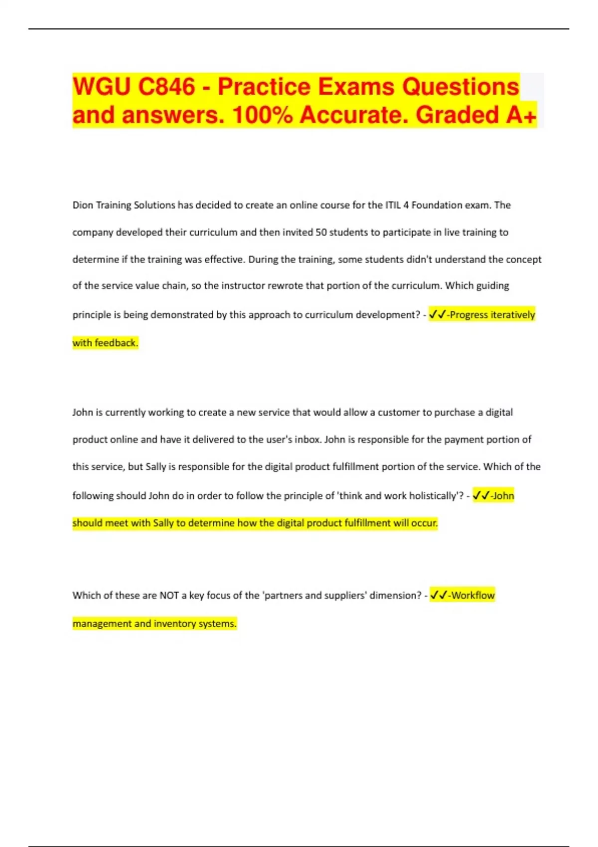 Dion Training Solutions has decided to create an online course for the ITIL 4 Foundation exam. The company developed their curriculum and then invited 50 students to participate in live training to determine if the training was effective. During the training, some students didn't understand the concept of the service value chain, so the instructor rewrote that portion of the curriculum. Which guiding principle is being demonstrated by this approach to curriculum development? - -Progress iteratively with feedback. John is currently working to create a new service that would allow a customer to purchase a digital product online and have it delivered to the user's inbox. John is responsible for the payment portion of this service, but Sally is responsible for the digital product fulfillment portion of the service. Which of the following should John do in order to follow the principle of 'think and work holistically'? - -John should meet with Sally to determine how the digital product fulfillment will occur. Which of these are NOT a key focus of the 'partners and suppliers' dimension? - -Workflow management and inventory systems.Which step of the continual improvement model states that "each improvement initiative should support the organization's goals and objectives"? - -What is the vision