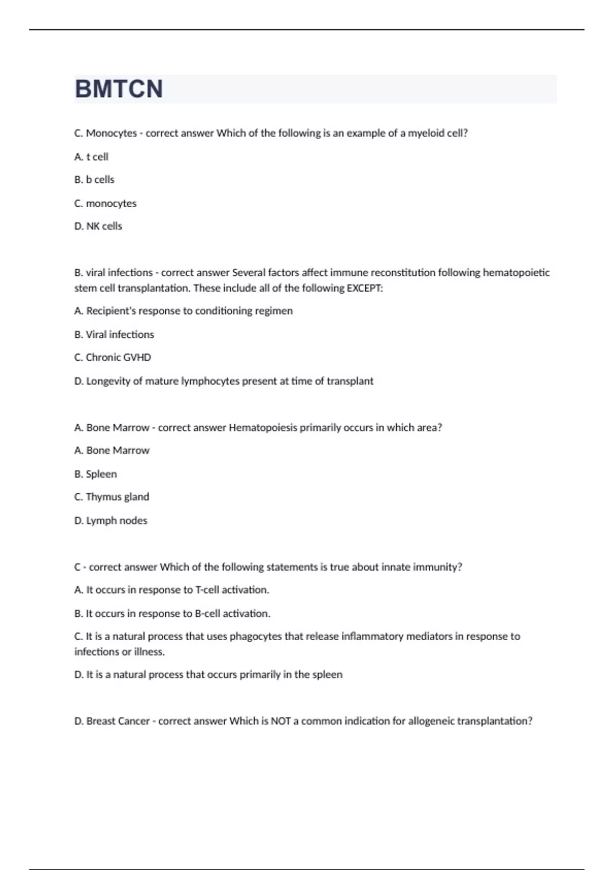 BMTCN C. Monocytes - correct answer Which of the following is an example of a myeloid cell? A. t cell B. b cells C. monocytes D. NK cells B. viral infections - correct answer Several factors affect immune reconstitution following hematopoietic stem cell transplantation. These include all of the following EXCEPT: A. Recipient's response to conditioning regimen B. Viral infections C. Chronic GVHD D. Longevity of mature lymphocytes present at time of transplant A. Bone Marrow - correct answer Hematopoiesis primarily occurs in which area? A. Bone Marrow B. Spleen C. Thymus gland D. Lymph nodes C - correct answer Which of the following statements is true about innate immunity? A. It occurs in response to T-cell activation. B. It occurs in response to B-cell activation. C. It is a natural process that uses phagocytes that release inflammatory mediators in response to infections or illness. D. It is a natural process that occurs primarily in the spleen D. Breast Cancer - correct answer Which is NOT a common indication for allogeneic transplantation? A. AML B. MDS C. CML D. Breast Cancer C - correct answer GVT effect is promoted by which of the following? A. Withdrawal of immunosuppressive therapy. B. Administration of DLI C. A and B D. Increased dose of immunosuppressive therapy D. Recommend over the counter medication for management of post-HSCT symptoms - correct answer Which of the following is NOT a role of a caregiver? A. Provide physical and emotional support B. Assist with recovery following HSCT C. Assist with medication administration D. Recommend over the counter medication for management of post-HSCT symptoms D. himself - correct answer M.J. is to undergo an auto transplant. From whom will he receive his stem cells? A. A matched related donor. B. A matched unrelated donor. C. An umbilical cord blood D. Himself A. graft failure - correct answer P.F. has undergone an allogeneic transplant using umbilical cord blood as the stem cell source. This makes her at higher risk for which of the following post-transplant complications? A. Graft failure B. GVHD