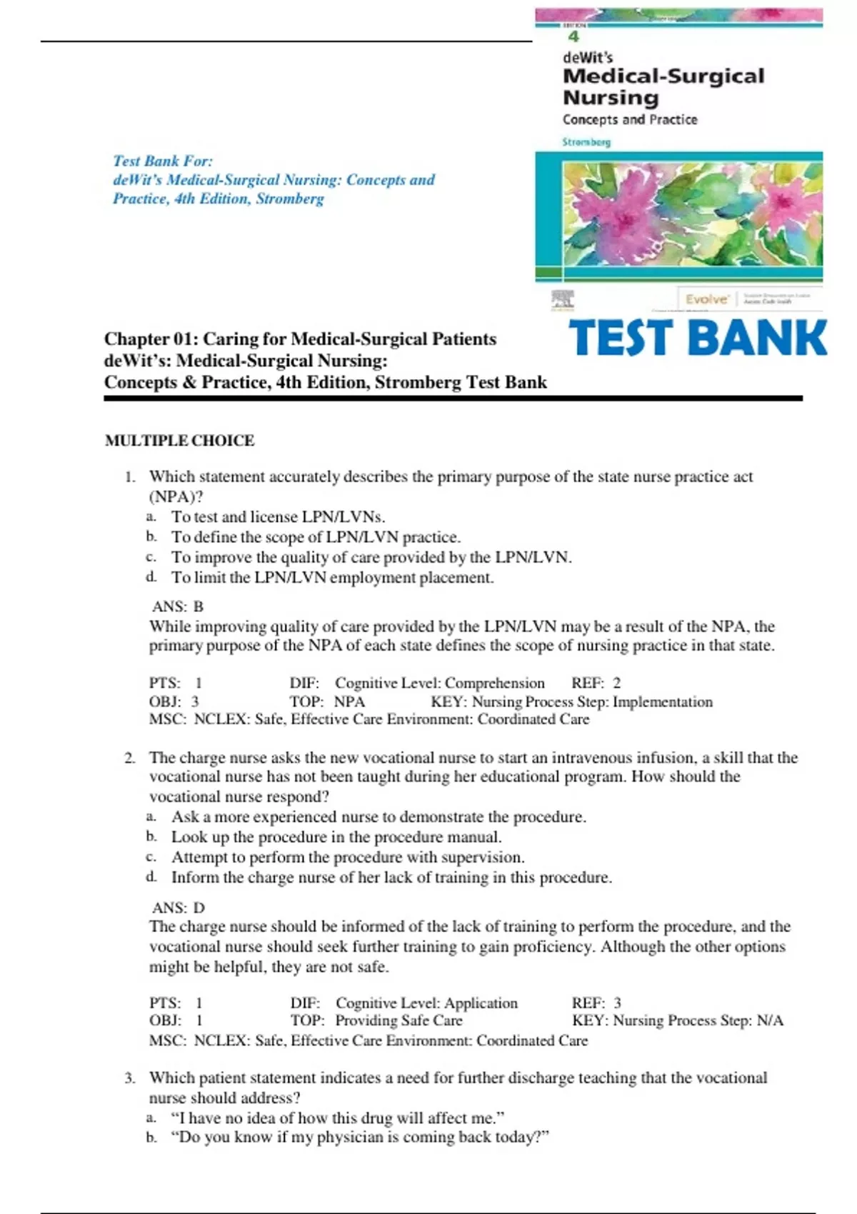 Chapter 01: Caring for Medical -Surgical Patients deWit’s : Medical -Surgical Nursing: Concepts & Practice, 4th Edition , Stromberg Test Bank MULTIPLE CHOICE 1. Which statement accurately describes the primary purpose of the state nurse practice act (NPA)? a. To test and license LPN/LVNs. b. To define the scope of LPN/LVN practice. c. To improve the quality of care provided by the LPN/LVN. d. To limit the LPN/LVN employment placement. ANS: B While improving quality of care provided by the LPN/LVN may be a result of the NPA, the primary purpose of the NPA of each state defines the scope of nursing practice in that state. PTS: 1 DIF: Cognitive Level: Comprehension REF: 2 OBJ: 3 TOP: NPA KEY: Nursing Process Step: Implementation MSC: NCLEX: Safe, Effective Care Envir onment: Coordinated Care 2. The charge nurse asks the new vocational nurse to start an intravenous infusion, a skill that the vocational nurse has not been taught during her educational program. How should the vocational nurse respond? a. Ask a more experienced nurse to demonstrate the procedure. b. Look up the procedure in the procedure manual. c. Attempt to perform the procedure with supervision. d. Inform the charge nurse of her lack of training in this procedure. ANS: D The charge nurse should be informed of the lack of training to perform the procedure, and the vocational nurse should seek further training to gain proficiency. Although the other options might be helpful, they are not safe. PTS: 1 DIF: Cognitive Level: Application REF: 3 OBJ: 1 TOP: Providing Safe Care KEY: Nursing Process Step: N/A MSC: NCLEX: Safe, Effective Care Environment: Coordinated Care 3. Which patient statement indicates a need for further discharge teaching that the vocational nurse should address? a. “I have no idea of how this drug will affect me.” b. “Do you know if my physician is coming back today?” TEST BANK Test Bank For: deWit’s Medical -Surgical Nursing : Concepts and Practice, 4th Edition, Stromberg c. “Will my insurance pay for my stay?” d. “Am I going to have to go to a nursing home?” ANS: A Lack of knowledge at discharge about medication effects and side effects is a concern that should be addre ssed by the vocational nurse. The other concerns in the options are the responsibility of other departments to which the nurse might refer the patient. PTS: 1 DIF: Cognitive Level: Application REF: 2 OBJ: 1 TOP: Teaching KEY: Nursing Process Step: Implementation MSC: NCLEX: Safe, Effective Care Environment: Coordinated Care 4. According to most state NPAs, the vocational nurse acting as charge nurse in a long-term care facility acts in which capacity? a. Working under direct supervision of an RN on the unit b. Working with the RN in the building c. Working under general supervision by the RN available on site or by phone d. Working as an independent vocational nurse ANS: C The vocational nurse in the capacity of the charge nurse in a long-term care facility acts with the general supervision of an RN available on site or by phone. PTS: 1 DIF: Cognitive Level: Comprehension REF: 2 OBJ: 1 TOP: Charge Nurse/Manager KEY: Nursing Process Step: N/A MSC: NCLEX: Safe, Effective Care Environment: Coordinated Care 5. The nurse is educating a patient that is a member of a health maintenance organization (HMO). Which information should the nurse include? a. Seek the opinion of an alternate health care provider. b. Obtain insurance approval for medical services prior to treatment. c. Prov ide detailed documentation of all care received for his condition. d. Wait at least 6 months to see a specialist. ANS: B Most HMOs require preprocedure authorization for treatment. Patients are not required to seek a second opinion, provide documentation of care, or wait a specific time period before visiting a specialist. PTS: 1 DIF: Cognitive Level: Application REF: 9 OBJ: 9 TOP: Charge Nurse/Manager KEY: Nursing Process Step: Implementation MSC: NCLEX: Safe, Effective Care Environment: Coordinated Care 6. The patient complains to the nurse that he is confused about his “deductible” that he owes the hospital. Which statement accurately explains a deductible? a. An amount of money put aside for the payment of future medical bills b. A one-time fee for service c. An amou nt of money deducted from the bill by the insurance company d. An annual amount of money the patient must pay out-of-pocket for medical care ANS: D The deductible is the annual amount the insured must pay out-of-pocket prior to the insurance company assuming the cost. This practice improves the profit of the insurance company. PTS: 1 DIF: Cognitive Level: Comprehension REF: 7 OBJ: 9 TOP: Health Care Financing KEY: Nursing Process Step: Implementation MSC: NCLEX: Safe, Effective Care Environment: Coordinated Care 7. The nurse compares the characteristics of a health maintenance organization (HMO) and a preferred provider organization (PPO). Which information should the nurse include about HMOs? a. HMOs require a set fee of each member monthly. b. HMOs allow the member to select his health care provider. c. HMOs permit admission to any facility the member prefers. d. HMOs offer unlimited diagnostic tests and treatments. ANS: A HMOs require a set fee from each member monthly (capitation). The patient will be treated by the HMO staff in HMO -approved facilities. Excessive use of diagnostic tests and treatments is discouraged by the HMO. PTS: 1 DIF: Cognitive Level: Application REF: 9 OBJ: 9 TOP: Managed Care KEY: Nursing Process Step: Implementation MSC: NCLEX: Safe, Effective Care Environment: Coordinated Care 8. A patient asks the nurse what Medicare Part A covers. Which response is correct? a. Medicare Part A covers inpatient hospital costs. b. Medicare Part A covers reimbursement to the physician. c. Medicare Part A covers outpatient hospital services. d. Medicare Part A covers ambulance transportation. ANS: A Medicare Part A covers inpatient hospital expenses, drugs, x -rays, labo