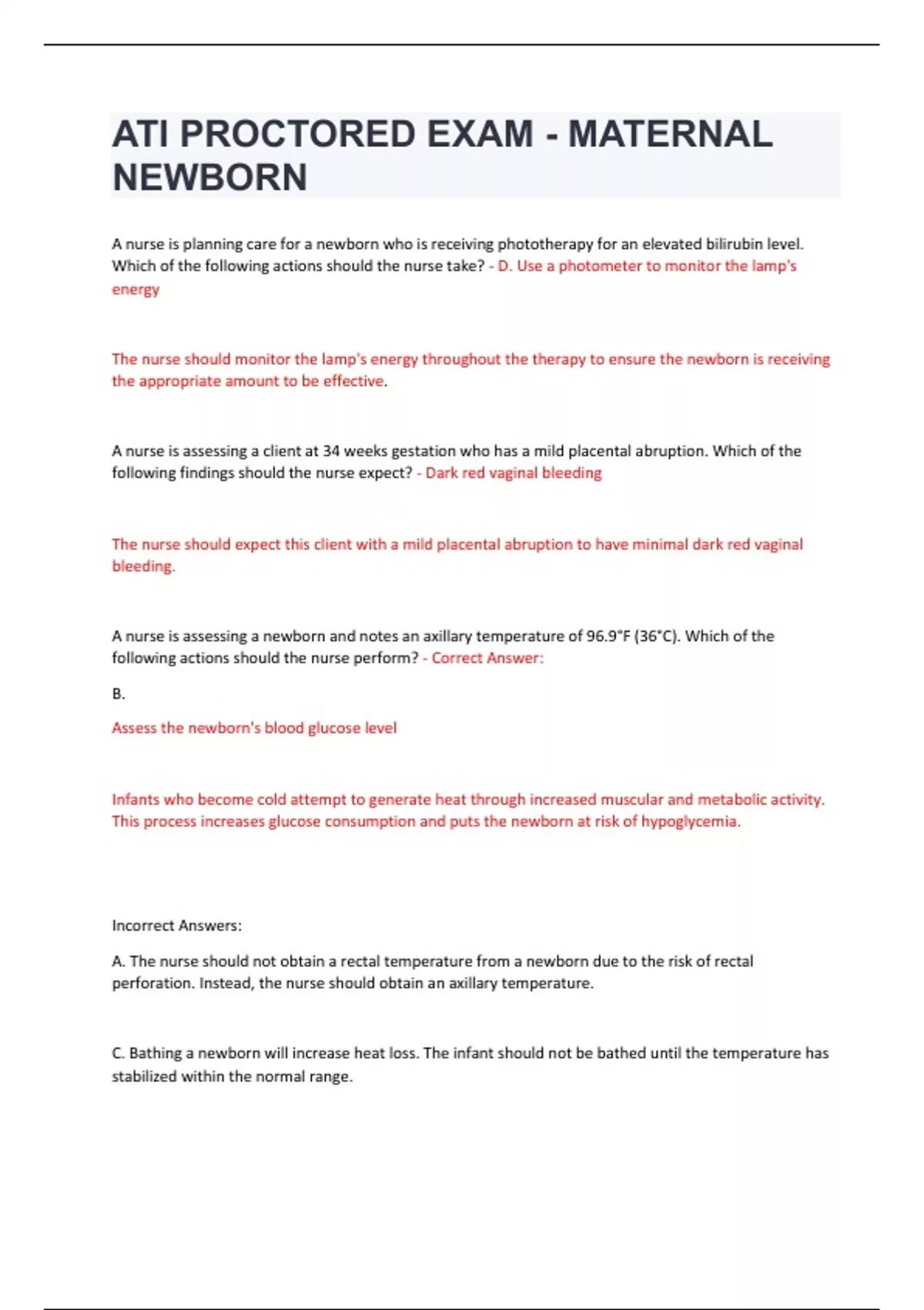 ATI PROCTORED EXAM - MATERNAL NEWBORN A nurse is planning care for a newborn who is receiving phototherapy for an elevated bilirubin level. Which of the following actions should the nurse take? - D. Use a photometer to monitor the lamp's energy The nurse should monitor the lamp's energy throughout the therapy to ensure the newborn is receiving the appropriate amount to be effective. A nurse is assessing a client at 34 weeks gestation who has a mild placental abruption. Which of the following findings should the nurse expect? - Dark red vaginal bleeding The nurse should expect this client with a mild placental abruption to have minimal dark red vaginal bleeding. A nurse is assessing a newborn and notes an axillary temperature of 96.9°F (36°C). Which of the following actions should the nurse perform? - Correct Answer: B. Assess the newborn's blood glucose level Infants who become cold attempt to generate heat through increased muscular and metabolic activity. This process increases glucose consumption and puts the newborn at risk of hypoglycemia. Incorrect Answers: A. The nurse should not obtain a rectal temperature from a newborn due to the risk of rectal perforation. Instead, the nurse should obtain an axillary temperature. C. Bathing a newborn will increase heat loss. The infant should not be bathed until the temperature has stabilized within the normal range.D. Placing the infant in front of a heater vent can incur heat loss through convection. Additionally, there is a potential fire risk from the bassinet linens and the vent. A nurse is caring for a client who is in preterm labor and is receiving magnesium sulfate. The client begins to show indications of magnesium sulfate toxicity. Which of the following medications should the nurse prepare to administer? - Correct Answer: C. Calcium gluconate The nurse should discontinue the magnesium sulfate infusion immediately and prepare to administer calcium gluconate IV to reverse the effects of magnesium sulfate and to prevent cardiac and respiratory arrest. Incorrect Answers: A. Protamine sulfate helps reverse the effects of heparin, not magnesium sulfate. B. Naloxone is an opioid reversal agent. It does not reverse the effects of magnesium sulfate. D. Flumazenil reverses the effects of benzodiazepines such as lorazepam and alprazolam, not magnesium sulfate. A nurse is providing postpartum discharge teaching to a client who is non-lactating about breast discomfort relief measures. Which of the following pieces of information should the nurse include? - Correct Answer: "Place fresh cabbage leaves on your breasts." After 3 days postpartum, the client's breasts can become swollen and distended because of congestion of the vascular structures of the breasts. Fresh cabbage leaves can be applied to engorged breasts to help relieve breast discomfort. The coolness of the leaves and the phytoestrogens exert a therapeutic effect on engorged breasts.Leaves should be replaced when they become wilted. Incorrect Answers: A. The client should be instructed to wear a tight-fitting bra or breast binders to alleviate engorgement and swelling. C. Application of warmth to the breasts should be avoided because heat can stimulate milk production. An ice pack should be used to relieve engorged breasts. D. Milk should not be expressed from the breasts. This intervention would increase milk production rather than decrease it. A nurse is educating a client who is at 10 weeks gestation and reports frequent nausea and vomiting. Which of the following statements should the nurse include in the teaching? - Correct Answer: D. "You should eat dry foods that are high in carbohydrates when you wake up." The nurse should instruct the client to eat foods that are high in carbohydrates such as dry toast or crackers upon waking or when nausea occurs. Incorrect Answers: A. The nurse should instruct the client to eat foods served at cool temperatures to decrease nausea and vomiting. B. The nurse should instruct the client to avoid brushing her teeth immediately after eating to decrease vomiting. C. The nurse should instruct the client to eat salty and tart foods during periods of nausea. A nurse is providing postpartum discharge teaching for a client who is breastfeeding. The client states, "I've heard that I can't use any birth control until I stop breastfeeding." Which of the following responses should the nurse make? - Correct Answer: