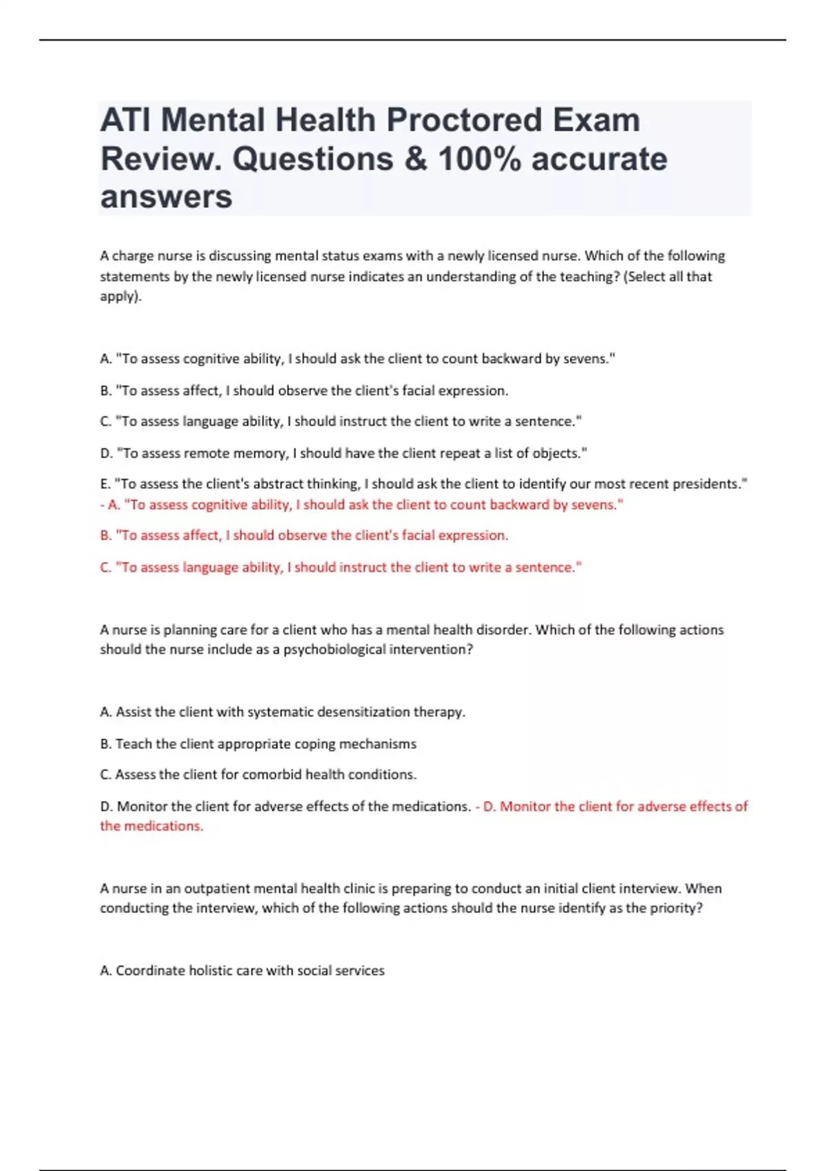 ATI Mental Health Proctored Exam Review. Questions & 100% accurate answers A charge nurse is discussing mental status exams with a newly licensed nurse. Which of the following statements by the newly licensed nurse indicates an understanding of the teaching? (Select all that apply). A. "To assess cognitive ability, I should ask the client to count backward by sevens." B. "To assess affect, I should observe the client's facial expression. C. "To assess language ability, I should instruct the client to write a sentence." D. "To assess remote memory, I should have the client repeat a list of objects." E. "To assess the client's abstract thinking, I should ask the client to identify our most recent presidents." - A. "To assess cognitive ability, I should ask the client to count backward by sevens." B. "To assess affect, I should observe the client's facial expression. C. "To assess language ability, I should instruct the client to write a sentence." A nurse is planning care for a client who has a mental health disorder. Which of the following actions should the nurse include as a psychobiological intervention? A. Assist the client with systematic desensitization therapy. B. Teach the client appropriate coping mechanisms C. Assess the client for comorbid health conditions. D. Monitor the client for adverse effects of the medications. - D. Monitor the client for adverse effects of the medications. A nurse in an outpatient mental health clinic is preparing to conduct an initial client interview. When conducting the interview, which of the following actions should the nurse identify as the priority? A. Coordinate holistic care with social servicesB. Identify the client's perception of her mental health status. C. Include the client's family in the interview. D. Teach the client about her current mental health disorder. - B. Identify the client's perception of her mental health status. A nurse is told during change of shift report that a client is stuporous. When assessing the client, which of the following findings should the nurse expect? A. The client arouses briefly in response to a sternal rub. B. The client has a glasgow coma scale score less than 7. C. The client exhibits decorticate rigidity. D. The client is alert but disoriented to time and place. - A. The client arouses briefly in response to a sternal rub. A nurse is planning a peer group discussion about the DSM-5. Which of the following information is appropriate to include in the discussion? (Select all that apply) A. The DSM-5 includes client education handouts for mental health disorders. B. The DSM-5 establishes diagnostic criteria for individual mental health disorders. C. The DSM-5 indicates recommended pharmacological treatment for mental health disorders. D. The DSM-5 assists nurses in planning care for client's who have mental health disorders. E. The DSM-5 indicates expected assessment findings of mental health disorders. - B. The DSM-5 establishes diagnostic criteria for individual mental health disorders. D. The DSM-5 assists nurses in planning care for client's who have mental health disorders. E. The DSM-5 indicates expected assessment findings of mental health disorders. A nurse in an emergency mental health facility is caring for a group of clients. The nurse should identify that which of the following clients requires a temporary emergency admission? A. A client who has schizophrenia with delusions of grandeur B. A client who has manifestations of depression and attempted suicide a year agoC. A client who has borderline personality disorder and assaulted a homeless man with a metal rod D. A client who has bipolar disorder and paces quickly around the room while talking to himself - C. A client who has borderline personality disorder and assaulted a homeless man with a metal rod A nurse decides to put a client who has a psychotic disorder in seclusion overnight because the unit is very short-staffed, and the client frequently fights with other clients. The nurse's actions are an example of which of the following torts? A. Invasion of privacy B. False imprisonment C. Assault D. Battery - B. False imprisonment A client tells a nurse, "Don't tell anyone but I hid a sharp knife under my mattress in order to protect myself from my roommate, who is always yelling at me and threatening me." Which of the following actions should the nurse take? A. Keep the client's communication confidential, but talk to the client daily, using therapeutic communication to convince him to admit to hiding the knife B. Keep the client's communication confidential, but watch the client and his roommate closely. C. Tell the client that this must be reported to the health care team because it concerns the health and safety of the client and others. D. Report the incident to the health care team, but do not inform the client of the intention to do so. - D. Report the incident to the health care team, but do not inform the client of the intention to do so. A nurse is caring for a client who is in mechanical restraints. Which of the following statements should the nurse include in the documentation? (Select all that apply) A. "Client ate most of his breakfast." B. "Client was offered 8 oz of water every hr." C. "Client shouted obscenities at assistive personnel." D. "Client received chlorpromazine 15 mg by mouth at 1000."