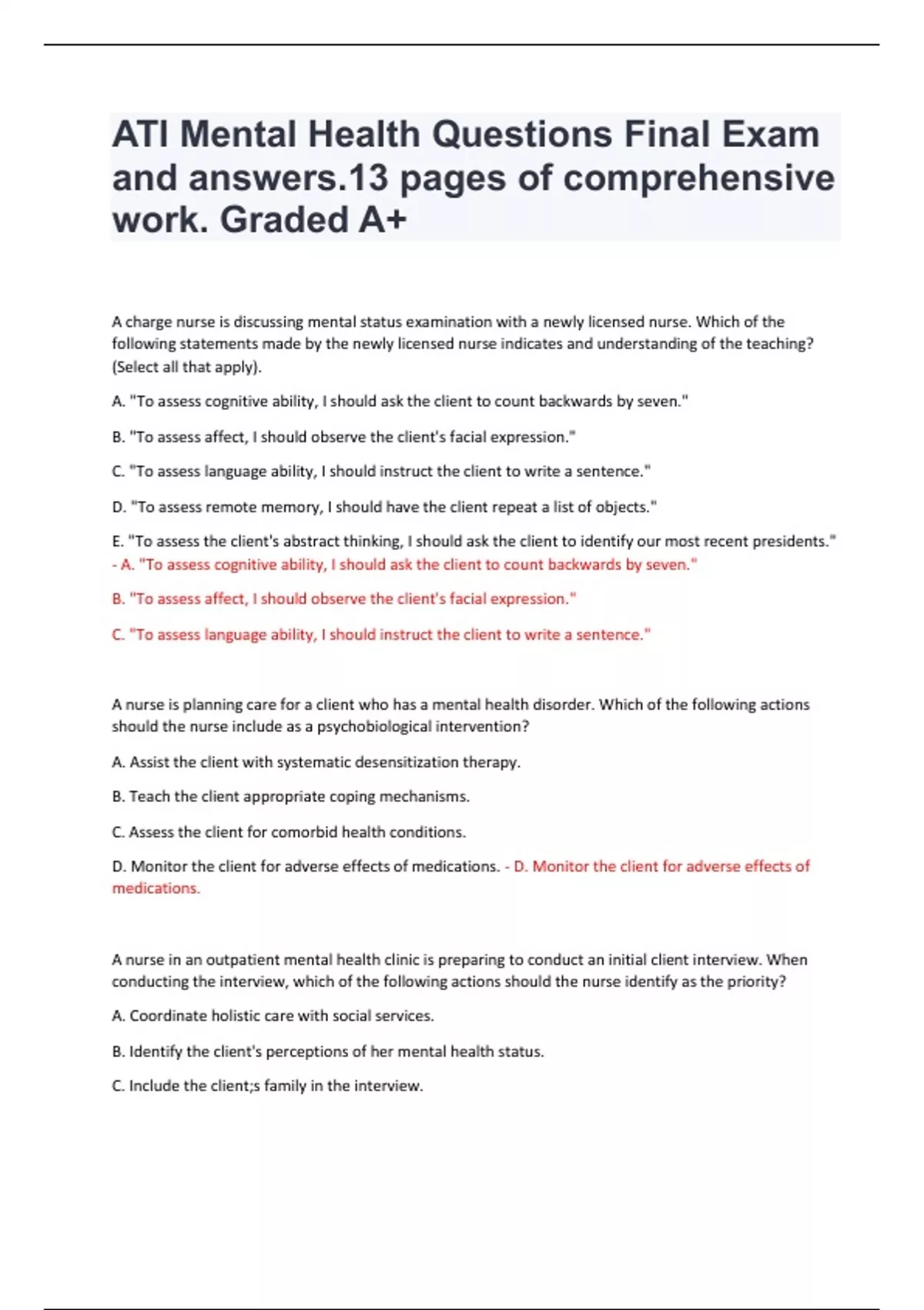 ATI Mental Health Questions Final Exam and answers.13 pages of comprehensive work. Graded A+