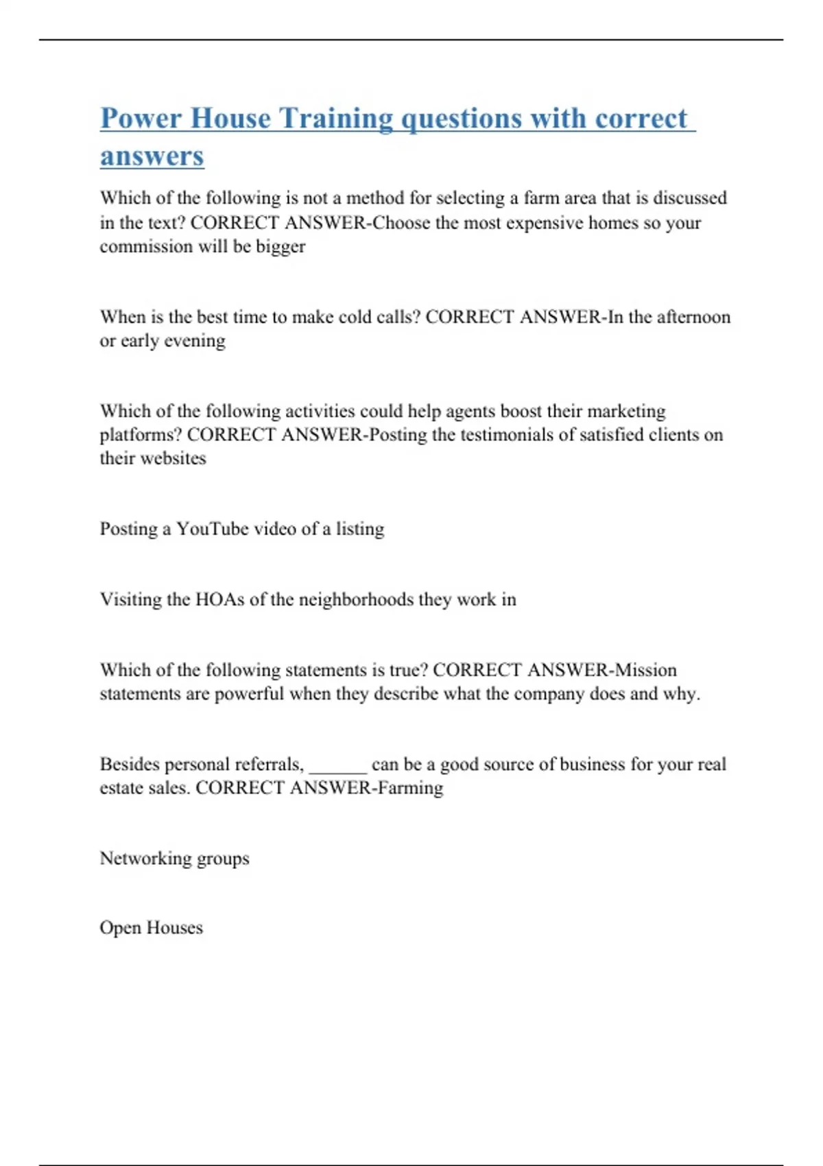 Which of the following is not a method for selecting a farm area that is discussed in the text? CORRECT ANSWER-Choose the most expensive homes so your commission will be bigger When is the best time to make cold calls? CORRECT ANSWER-In the afternoon or early evening Which of the following activities could help agents boost their marketing platforms? CORRECT ANSWER-Posting the testimonials of satisfied clients on their websites Posting a YouTube video of a listing Visiting the HOAs of the neighborhoods they work in Which of the following statements is true? CORRECT ANSWER-Mission statements are powerful when they describe what the company does and why. Besides personal referrals, ______ can be a good source of business for your real estate sales. CORRECT ANSWER-Farming Networking groups Open Houses