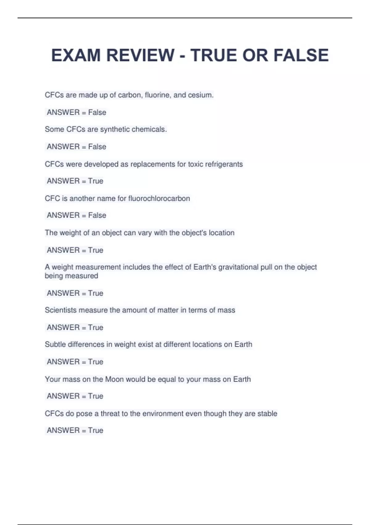 EXAM REVIEW - TRUE OR FALSE CFCs are made up of carbon, fluorine, and cesium. ANSWER = False Some CFCs are synthetic chemicals. ANSWER = False CFCs were developed as replacements for toxic refrigerants ANSWER = True CFC is another name for fluorochlorocarbon ANSWER = False The weight of an object can vary with the object's location ANSWER = True A weight measurement includes the effect of Earth's gravitational pull on the object being measured ANSWER = True Scientists measure the amount of matter in terms of mass ANSWER = True Subtle differences in weight exist at different locations on Earth ANSWER = True Your mass on the Moon would be equal to your mass on Earth ANSWER = True CFCs do pose a threat to the environment even though they are stable ANSWER = True CFCs usually react readily with other chemicals ANSWER = False The ozone layer is mostly located in the troposhere ANSWER = False Earth attracts all objects to its surface due to gravity ANSWER = True All matter that we encounter in everyday life exists in one of four physical forms ANSWER = False The particles in gas are spaced far apart ANSWER = True A solid has an indefinite shape and volume ANSWER = False A liquid has a definite shape and takes on the volume of its container. ANSWER = False A gas has both the shape and the volume of its container ANSWER = True The particles in a gas cannot be compressed into a smaller volume ANSWER = False Liquids tend to expand when heated ANSWER = True The words gas and vapor can be used interchangeably. ANSWER = False Ancent philosophers regularlyperformed controlled experiments. ANSWER = False