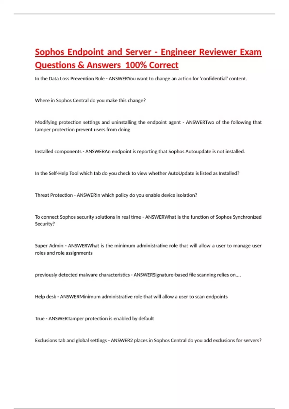 Sophos Endpoint and Server - Engineer Reviewer Exam Questions & Answers 100% Correct