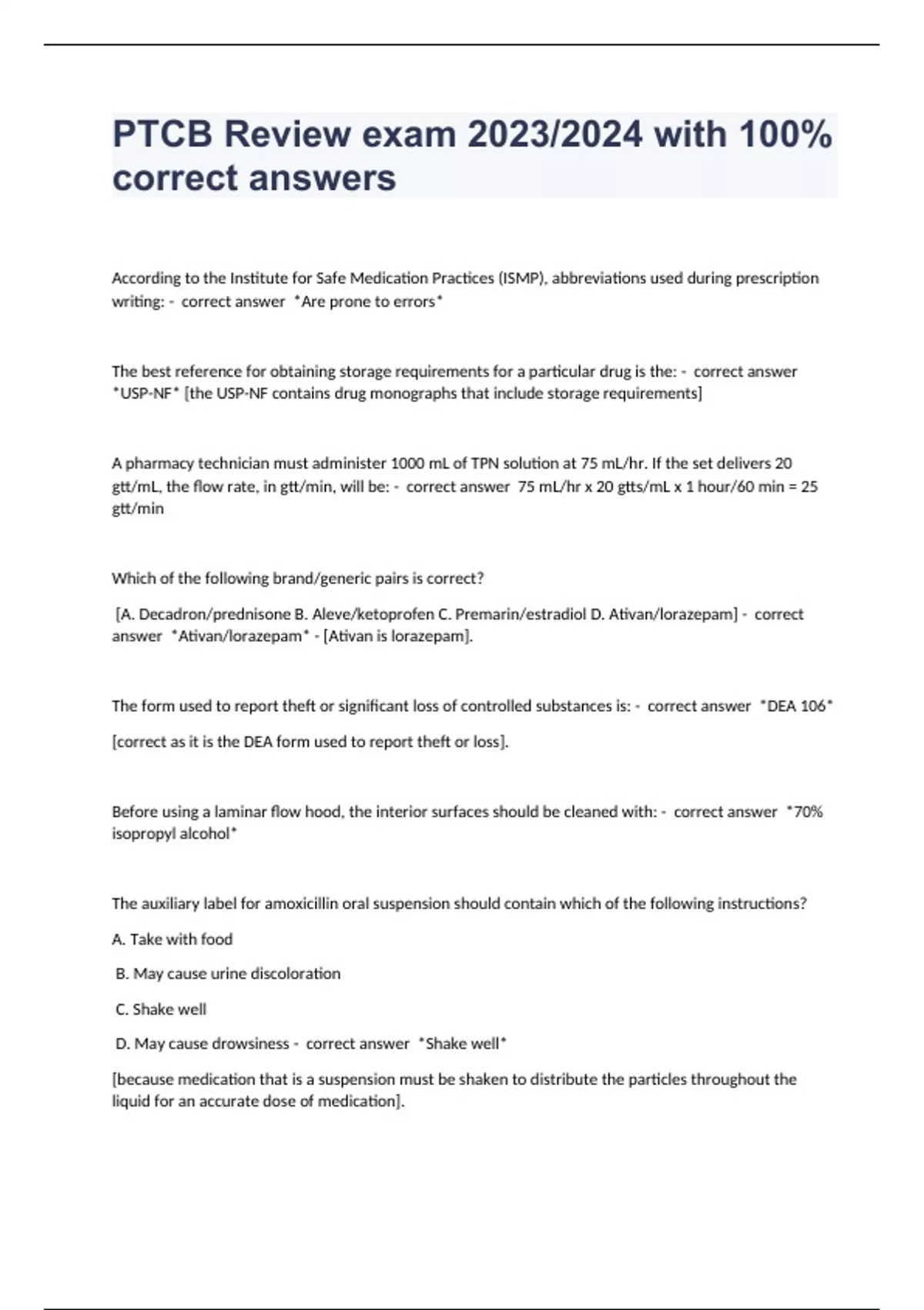 According to the Institute for Safe Medication Practices (ISMP), abbreviations used during prescription writing: - correct answer *Are prone to errors* The best reference for obtaining storage requirements for a particular drug is the: - correct answer *USP-NF* [the USP-NF contains drug monographs that include storage requirements] A pharmacy technician must administer 1000 mL of TPN solution at 75 mL/hr. If the set delivers 20 gtt/mL, the flow rate, in gtt/min, will be: - correct answer 75 mL/hr x 20 gtts/mL x 1 hour/60 min = 25 gtt/min Which of the following brand/generic pairs is correct? [A. Decadron/prednisone B. Aleve/ketoprofen C. Premarin/estradiol D. Ativan/lorazepam] - correct answer *Ativan/lorazepam* - [Ativan is lorazepam]. The form used to report theft or significant loss of controlled substances is: - correct answer *DEA 106* [correct as it is the DEA form used to report theft or loss]. Before using a laminar flow hood, the interior surfaces should be cleaned with: - correct answer *70% isopropyl alcohol* The auxiliary label for amoxicillin oral suspension should contain which of the following instructions? A. Take with food B. May cause urine discoloration C. Shake well D. May cause drowsiness - correct answer *Shake well* [because medication that is a suspension must be shaken to distribute the particles throughout the liquid for an accurate dose of medication]. An essential component of pharmacy quality assurance programs is to: A. maintain standards set by the DEA. B. focus on the individual employee's work performance. C. get the right drug to the right patient at the right time. D. provide adequate emergency stock levels - correct answer *Get the right drug to the right patient at the right time* [because pharmacy quality assurance programs are put in place to guarantee the "rights" of pharmacy practice]. Which of the following, when combined with acetaminophen 325 mg, would be a generic substitute for Tylenol No. 4? A. Codeine 15 mg B. Codeine 60 mg C. Oxycodone 7.5 mg D. Oxycodone 10 mg - correct answer *Codeine 60 mg* A reverse distributor for pharmaceuticals: - correct answer *Removes and disposes of pharmaceutical waste* [A reverse distributor picks up expired and damaged drugs for disposal as pharmaceutical waste and does not distribute nor transport drugs for use] According to ASHP guidelines, a quality improvement program for home care should monitor the patient's: - correct answer *Satisfaction and outcome*. Tylenol with codeine liquid is prescribed as "Give 2 teaspoonsful four times daily dispense 120 mL." The patient is a 2-year-old male. What is a possible reason to alert the pharmacist? - correct answer *AGE* [Because the daily dose of acetaminophen and codeine are above the recommended guidelines]. Which of the following is a valid DEA number for Dr. Thomas Jones? A. AT1234560 B. AJ1234563 C. AJ2345615 D. AT2683517 - correct answer *AJ1234563* [Because the second letter of a valid DEA number is always the initial of the prescriber's last name. If a DEA number is valid, the sum of the first, third, and fifth digits added to twice the sum of the second, fourth, and sixth digits yields a number with the same last digit as the seventh digit of the DEA number. For the key (B), you add (1+3+5) to 2x(2+4+6 ) and the sum is 9+24=33; 3 is the seventh digit] Which of the following sedative hypnotics is a benzodiazepine? A. Zolpidem B. Alprazolam C. Zalepon D. Eszopicione - correct answer *Alprazolam* (Xanax) [Is a benzodiazepine] When an albuterol inhaler is dispensed, the patient package insert (PPI) must be included: - correct answer *Every time the prescription is dispensed* [Because per federal law, patients must receive a patient package insert/instructions with each prescription, including refills] Which of the following medication pairs makes safe use of tall man letters? A. alpraZOLAM, lorazepam B. ALPRAZolam, LORazepam C. ALprazoLAM, LORazePAM D. alpraz