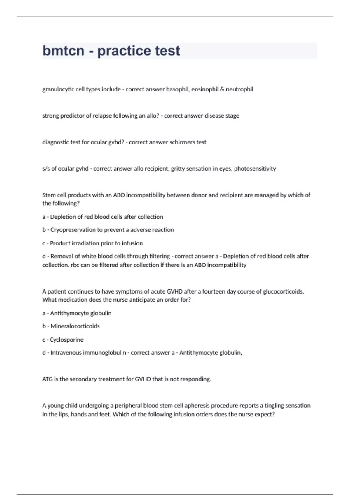 bmtcn - practice test granulocytic cell types include - correct answer basophil, eosinophil & neutrophil strong predictor of relapse following an allo? - correct answer disease stage diagnostic test for ocular gvhd? - correct answer schirmers test s/s of ocular gvhd - correct answer allo recipient, gritty sensation in eyes, photosensitivity Stem cell products with an ABO incompatibility between donor and recipient are managed by which of the following? a - Depletion of red blood cells after collection b - Cryopreservation to prevent a adverse reaction c - Product irradiation prior to infusion d - Removal of white blood cells through filtering - correct answer a - Depletion of red blood cells after collection. rbc can be filtered after collection if there is an ABO incompatibility A patient continues to have symptoms of acute GVHD after a fourteen day course of glucocorticoids. What medication does the nurse anticipate an order for? a - Antithymocyte globulin b - Mineralocorticoids c - Cyclosporine d - Intravenous immunoglobulin - correct answer a - Antithymocyte globulin, ATG is the secondary treatment for GVHD that is not responding. A young child undergoing a peripheral blood stem cell apheresis procedure reports a tingling sensation in the lips, hands and feet. Which of the following infusion orders does the nurse expect? a - Packed red blood cells b - Potassium c - Calcium gluconate d - Magnesium - correct answer c - Calcium gluconate, Citrate is commonly used as an anticoagulant during the apheresis procedure. Hypocalcemia is a common side effect of citrate, especially in small children Which statement by a nurse would indicate further teaching about transplant recipients is required? "Important criteria used to evaluate a patient for HSCT include: a - age of the caregivers." b - current disease status." c- support resources available to the patient." d - baseline organ function." - correct answer a - age of the caregivers." Age of the caregivers is not a criteria determining recipient status. The cluster of differentiation system is used to: a - crossmatch for blood product transfusion. b - identify different types of cytokines. c - measure immune function. d - classify cell surface proteins on leukocytes. - correct answer d - classify cell surface proteins on leukocytes. The cluster of differentiation system classifies cell surface proteins. The impact of stress on social function following transplant is greatest between: a - survivor and extended family members. b - child survivor and parent. c - survivor and spouse.