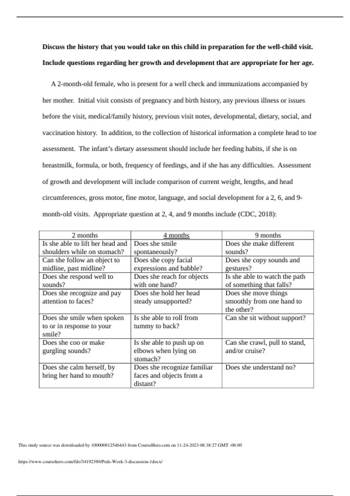 Discuss the history that you would take on this child in preparation for the well-child visit. Include questions regarding her growth and development that are appropriate for her age. A 2-month-old female, who is present for a well check and immunizations accompanied by her mother. Initial visit consists of pregnancy and birth history, any previous illness or issues before the visit, medical/family history, previous visit notes, developmental, dietary, social, and vaccination history. In addition, to the collection of historical information a complete head to toe assessment. The infant’s dietary assessment should include her feeding habits, if she is on breastmilk, formula, or both, frequency of feedings, and if she has any difficulties. Assessment of growth and development will include comparison of current weight, lengths, and head circumferences, gross motor, fine motor, language, and social development for a 2, 6, and 9