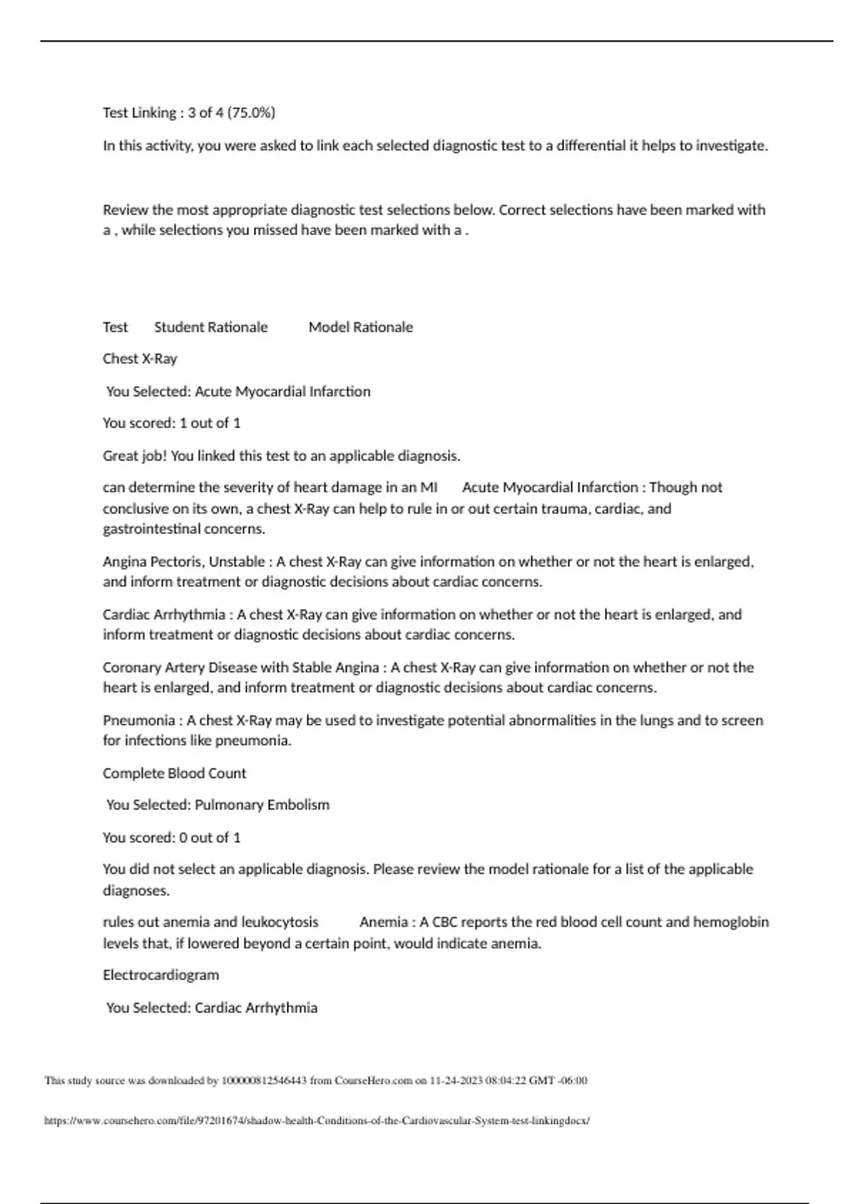 Test Linking : 3 of 4 (75.0%) In this activity, you were asked to link each selected diagnostic test to a differential it helps to investigate. Review the most appropriate diagnostic test selections below. Correct selections have been marked with a , while selections you missed have been marked with a . Test Student Rationale Model Rationale Chest X-Ray You Selected: Acute Myocardial Infarction You scored: 1 out of 1 Great job! You linked this test to an applicable diagnosis. can determine the severity of heart damage in an MI Acute Myocardial Infarction : Though not