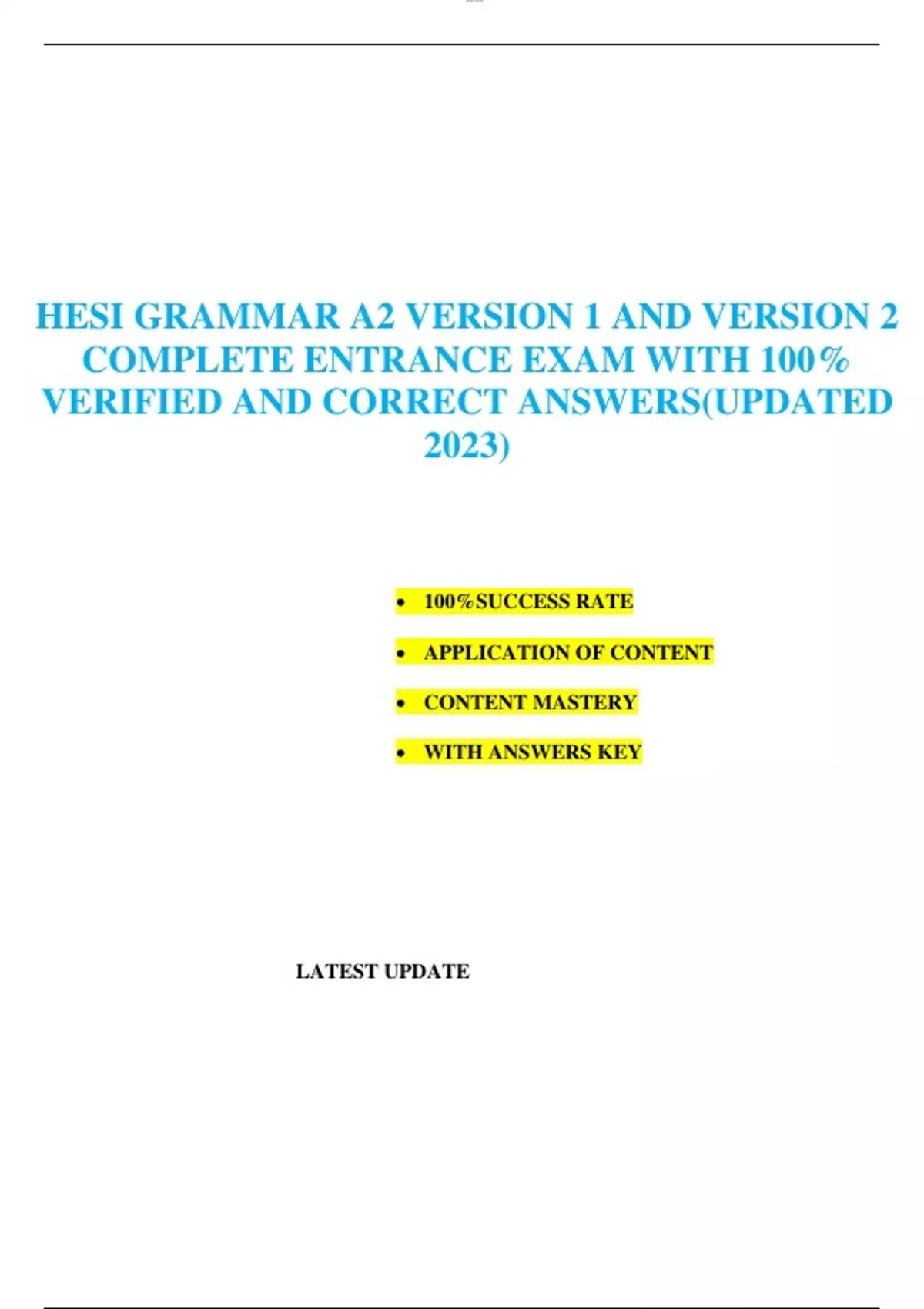 HESI GRAMMAR A2 VERSION 1 AND VERSION 2 COMPLETE ENTRANCE EXAM WITH 100% VERIFIED AND CORRECT ANSWERS(UPDATED 2023/2024) 100%SUCCESS RATE • APPLICATION OF CONTENT • CONTENT MASTERY • WITH ANSWERS KEY