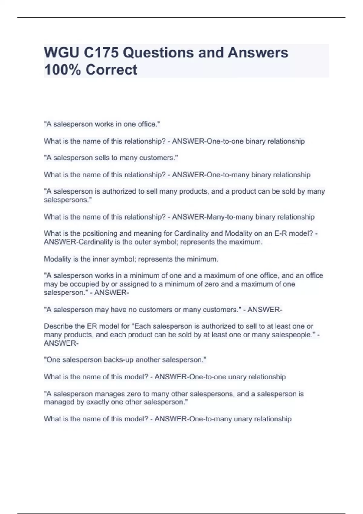 WGU C175 Questions and Answers 100% Correct WGU C175 Questions and Answers 100% Correct WGU C175 Questions and Answers 100% Correct "A salesperson works in one office." What is the name of this relationship? - ANSWER-One-to-one binary relationship "A salesperson sells to many customers." What is the name of this relationship? - ANSWER-One-to-many binary relationship "A salesperson is authorized to sell many products, and a product can be sold by many salespersons." What is the name of this relationship? - ANSWER-Many-to-many binary relationship What is the positioning and meaning for Cardinality and Modality on an E-R model? - ANSWER-Cardinality is the outer symbol; represents the maximum.