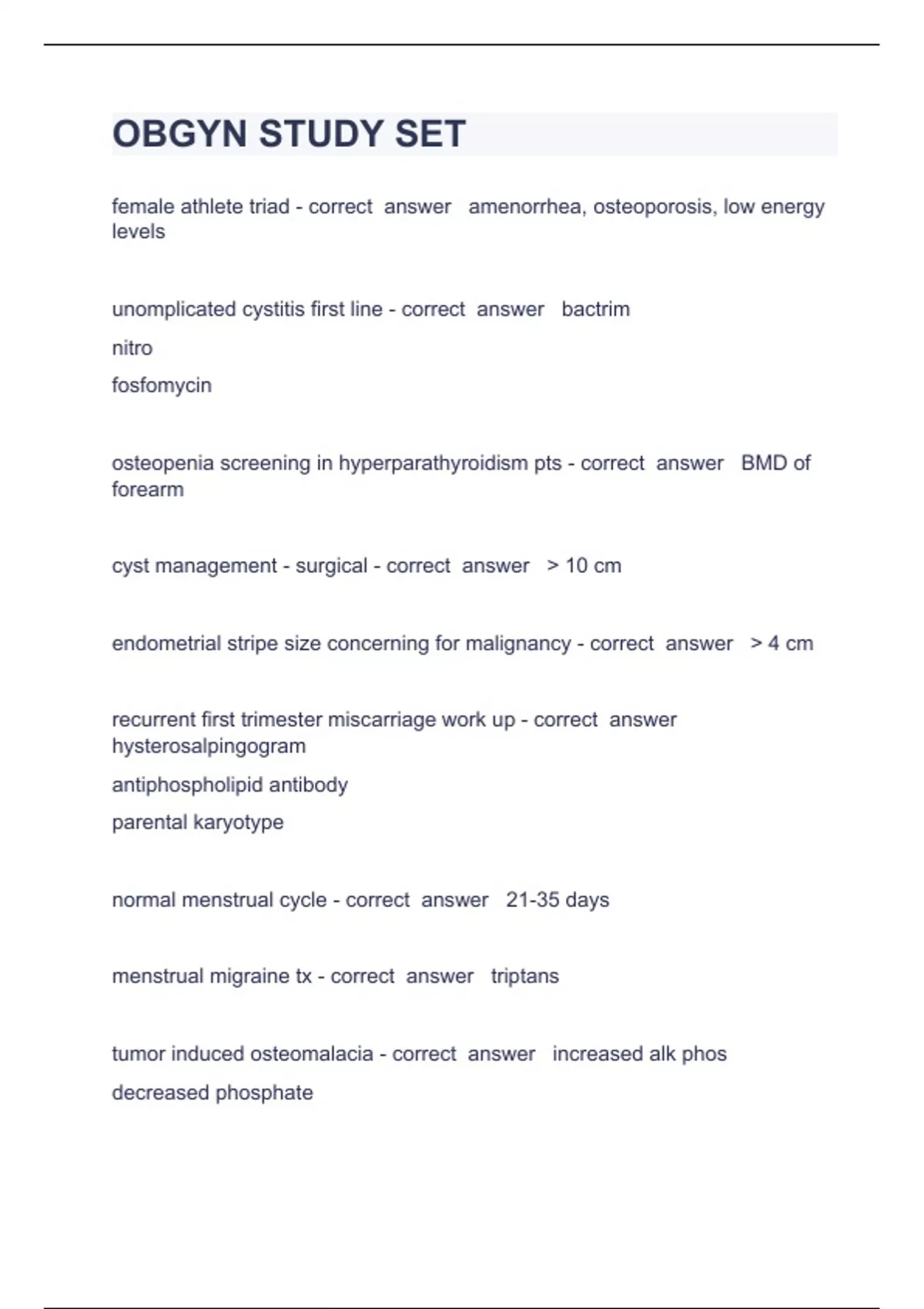 OBGYN STUDY SET Question and answers already passed 2023/2024female athlete triad - correct answer amenorrhea, osteoporosis, low energy levels unomplicated cystitis first line - correct answer bactrim nitro fosfomycin osteopenia screening in hyperparathyroidism pts - correct answer BMD of forearm cyst management - surgical - correct answer 10 cm endometrial stripe size concerning for malignancy - correct answer 4 cm recurrent first trimester miscarriage work up - correct answer hysterosalpingogram antiphospholip