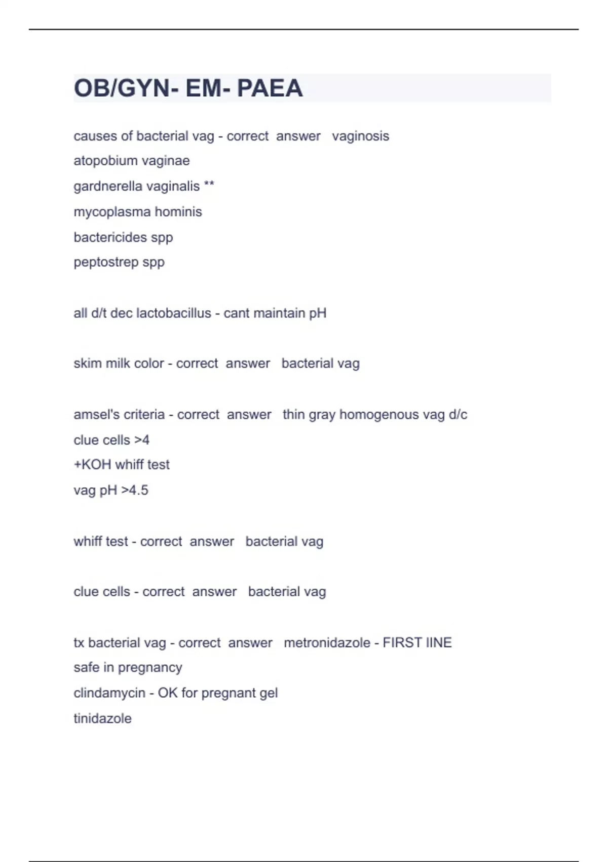 OB Question and answers already passed 2023/2024 causes of bacterial vag - correct answer vaginosis atopobium vaginae gardnerella vaginalis ** mycoplasma hominis bactericides spp peptostrep spp all d/t dec lactobacillus - cant maintain pH skim milk color - correct answer bacterial vag amsel's criteria - correct answer thin gray homogenous vag d/c clue cells 4 +KOH whiff test vag pH 4.5