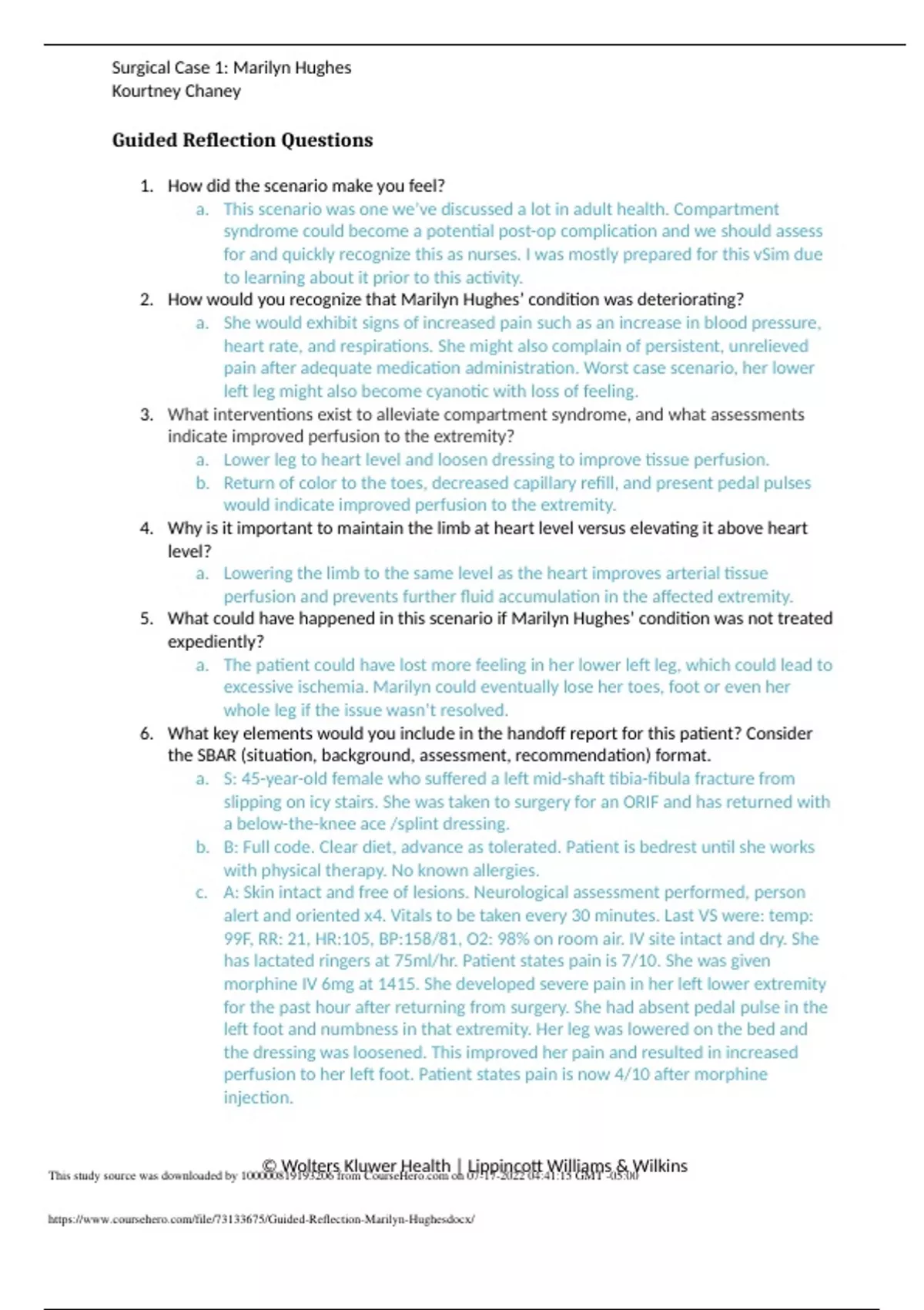 Surgical Case 1: Marilyn Hughes Kourtney Chaney Guided Reflection Questions 1. How did the scenario make you feel? a. This scenario was one we’ve discussed a lot in adult health. Compartment syndrome could become a potential post-op complication and we should assess for and quickly recognize this as nurses. I was mostly prepared for this vSim due to learning about it prior to this activity. 2. How would you recognize that Marilyn Hughes’ condition was deteriorating? a. She would exhibit signs of increased pain such as an increase in blood pressure, heart rate, and respirations. She might also complain of persistent, unrelieved pain after adequate medication administration. Worst case scenario, her lower left leg might also become cyanotic with loss of feeling. 3. What interventions exist to alleviate compartment syndrome, and what assessments indicate improved perfusion to the extremity? a. Lower leg to heart level and loosen dressing to improve tissue perfusion. b. Return of color to the toes, decreased capillary refill, and present pedal pulses would indicate improved perfusion to the extremity. 4. Why is it important to maintain the limb at heart level versus elevating it above heart level? a. Lowering the limb to the same level as the heart improves arterial tissue perfusion and prevents further fluid accumulation in the affected extremity. 5. What could have happened in this scenario if Marilyn Hughes’ condition was not treated expediently? a. The patient could have lost more feeling in her lower left leg, which could lead to excessive ischemia. Marilyn could eventually lose her toes, foot or even her whole leg if the issue wasn’t resolved. 6. What key elements would you include in the handoff report for this patient? Consider the SBAR (situation, background, assessment, recommendation) format. a. S: 45-year-old female who suffered a left mid-shaft tibia-fibula fracture from slipping on icy stairs. She was taken to surgery for an ORIF and has returned with a below-the-knee ace /splint dressing. b. B: Full code. Clear diet, advance as tolerated. Patient is bedrest until she works with physical therapy. No known allergies. c. A: Skin intact and free of lesions. Neurological assessment performed, person alert and oriented x4. Vitals to be taken every 30 minutes. Last VS were: temp: 99F, RR: 21, HR:105, BP:158/81, O2: 98% on room air. IV site intact and dry. She has lactated ringers at 75ml/hr. Patient states pain is 7/10. She was given morphine IV 6mg at 1415. She developed severe pain in her left lower extremity for the past hour after returning from surgery. She had absent pedal pulse in the left foot and numbness in that extremity. Her leg was lowered on the bed and the dressing was loosened. This improved her pain and resulted in increased perfusion to her left foot. Patient states pain is now 4/10 after morphine injection. © Wolters Kluwer Health | Lippincott Williams & Wilkin