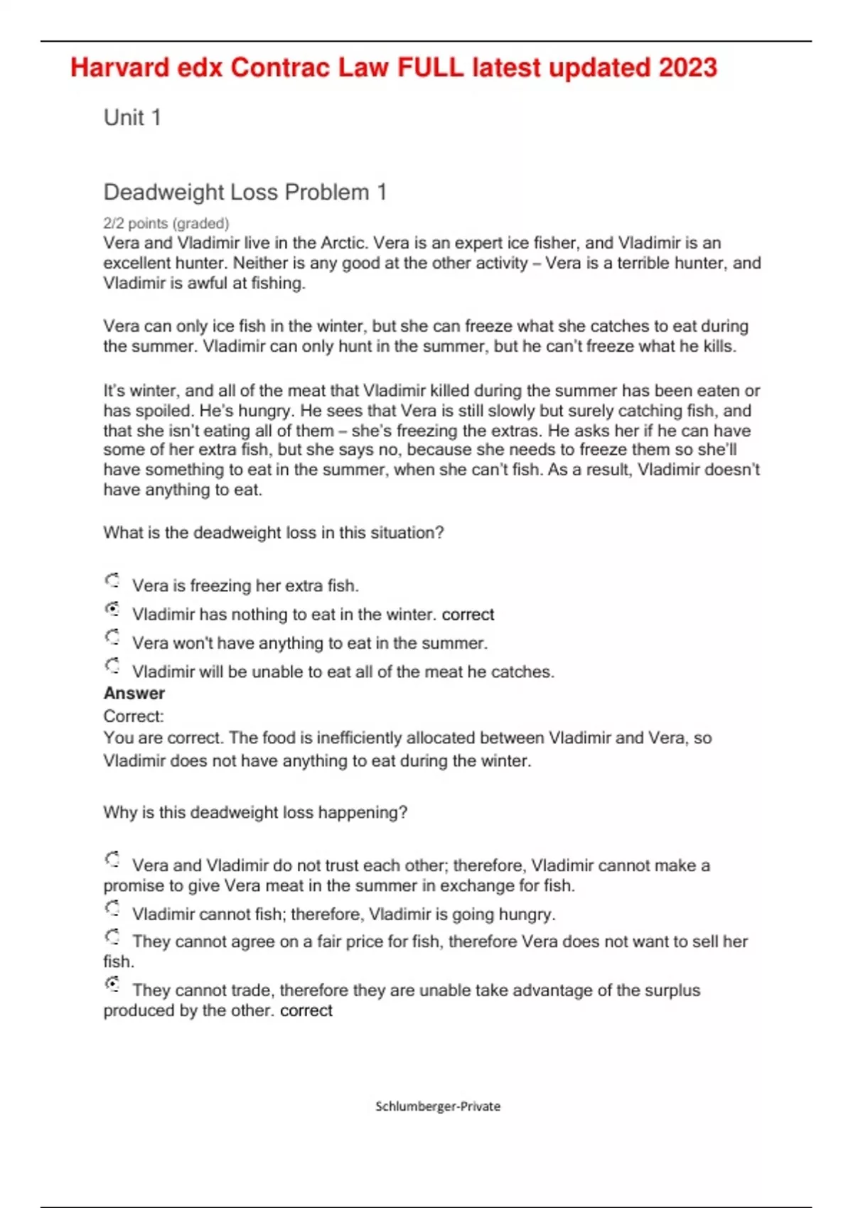 Harvard edx Contrac Law FULL latest updated 2023 Unit 1 Deadweight Loss Problem 1 2/2 points (graded) Vera and Vladimir live in the Arctic. Vera is an expert ice fisher, and Vladimir is an excellent hunter. Neither is any good at the other activity – Vera is a terrible hunter, and Vladimir is awful at fishing. Vera can only ice fish in the winter, but she can freeze what she catches to eat during the summer. Vladimir can only hunt in the summer, but he can’t freeze what he kills. It’s winter, and all of the meat that Vladimir killed during the summer has been eaten or has spoiled. He’s hungry. He sees that Vera is still slowly but surely catching fish, and that she isn’t eating all of them – she’s freezing the extras. He asks her if he can have some of her extra fish, but she says no, because she needs to freeze them so she’ll have something to eat in the summer, when she can’t fish. As a result, Vladimir doesn’t have anything to eat. What is the deadweight loss in this situation? Vera is freezing her extra fish. Vladimir has nothing to eat in the winter. correct Vera won't have anything to eat in the summer. Vladimir will be unable to eat all of the meat he catches. Answer Correct: You are correct. The food is inefficiently allocated between Vladimir and Vera, so Vladimir does not have anything to eat during the winter. Why is this deadweight loss happening? Vera and Vladimir do not trust each other; therefore, Vladimir cannot make a promise to give Vera meat in the summer in exchange for fish. Vladimir cannot fish; therefore, Vladimir is going hungry. They cannot agree on a fair price for fish, therefore Vera does not want to sell her fish. They cannot trade, therefore they are unable take advantage of the surplus produced by the other. correct Schlumberger-Private Harvard edx Contrac Law FULL latest updated 2023 Answer Correct: This is the correct answer. If Vladimir and Vera figured out a way to trade their surplus food, they could both have enough to eat throughout the year. Deadweight Loss Problem 2 2/2 points (graded) Alex and Amy are at a company dinner, where there is exactly one roll of silverware per person. Amy picks up a roll that accidentally contains two knives and no spoon, and discovers she has no way of eating her soup. Amy buttered and ate her bread. Meanwhile, Alex opens his roll to see that he has two spoons and no knife. He has some trouble buttering his bread, but he figures out a way to butter it with the spoon. This draws disapproving frowns from those around him. He has no trouble eating his soup. The dinner is very large, and Amy tries to search the room for someone with an extra spoon. But there are too many people, so she gives up. What are the deadweight losses in this situation? (Select 2 Answers) Amy could not eat her soup. Amy ate her bread. Alex made a mess buttering his bread. Amy wasted her time looking for a spoon without any s