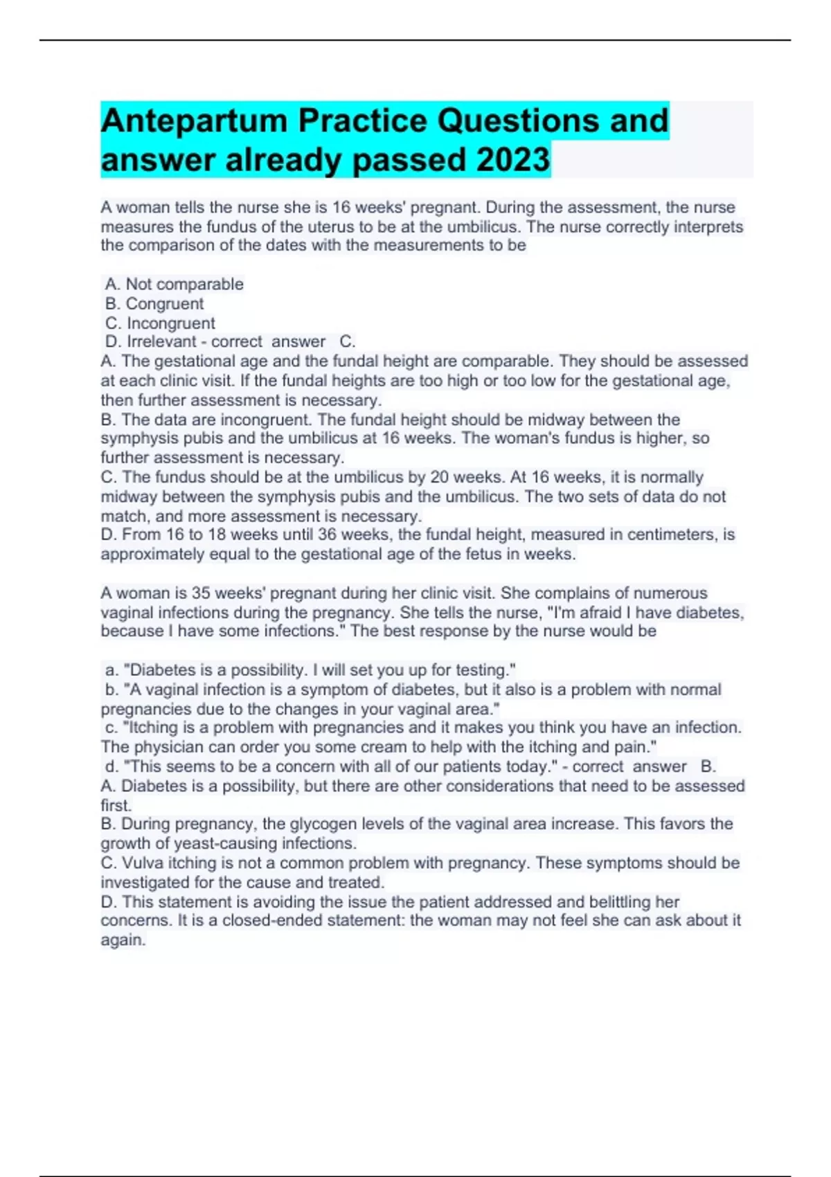 Antepartum Practice Questions and answer already passed 2023/2024A woman tells the nurse she is 16 weeks' pregnant. During the assessment, the nurse measures the fundus of the uterus to be at the umbilicus. The nurse correctly interprets the comparison of the dates with the measurements to be A. Not comparable B. Congruent C. Incongruent D. Irrelevant - correct answer C. A. The gestational age and the fundal height are comparable. They should be assessed at each clinic visit. If the fundal heights are too high or too low for the gestational age, then further assessment is necessary. B. The data are incongruent. The fundal height should be midway between the symphysis pubis and the umbilicus at 16 weeks. The woman's fundus is higher, so further assessment is necessary. C. The fundus should be at the umbilicus by 20 weeks. At 16 weeks, it is normally midway between the symphysis pubis and the umbilicus. The two sets of data do not match, and more assessment is necessary. D. From 16 to 18 weeks