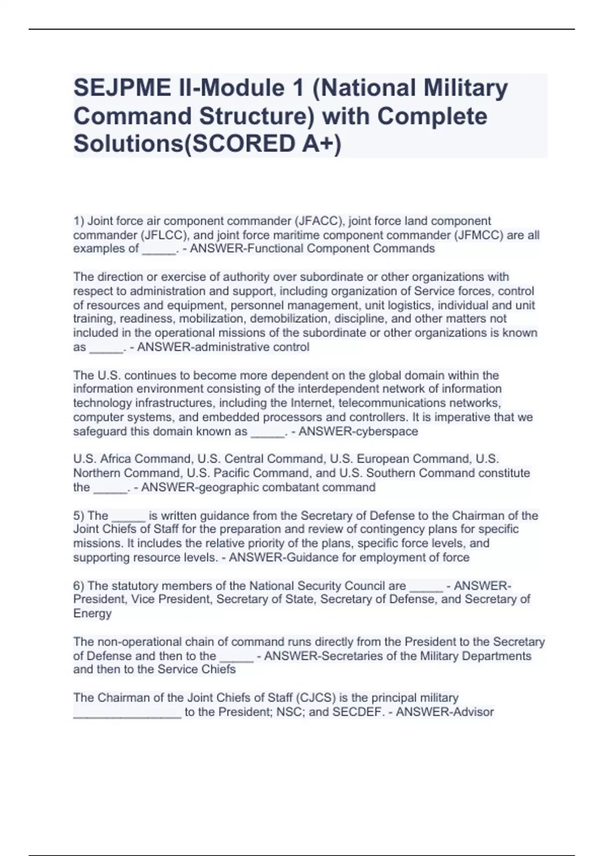 SEJPME II-Module 1 (National Military Command Structure) with Complete Solutions(SCORED A+)