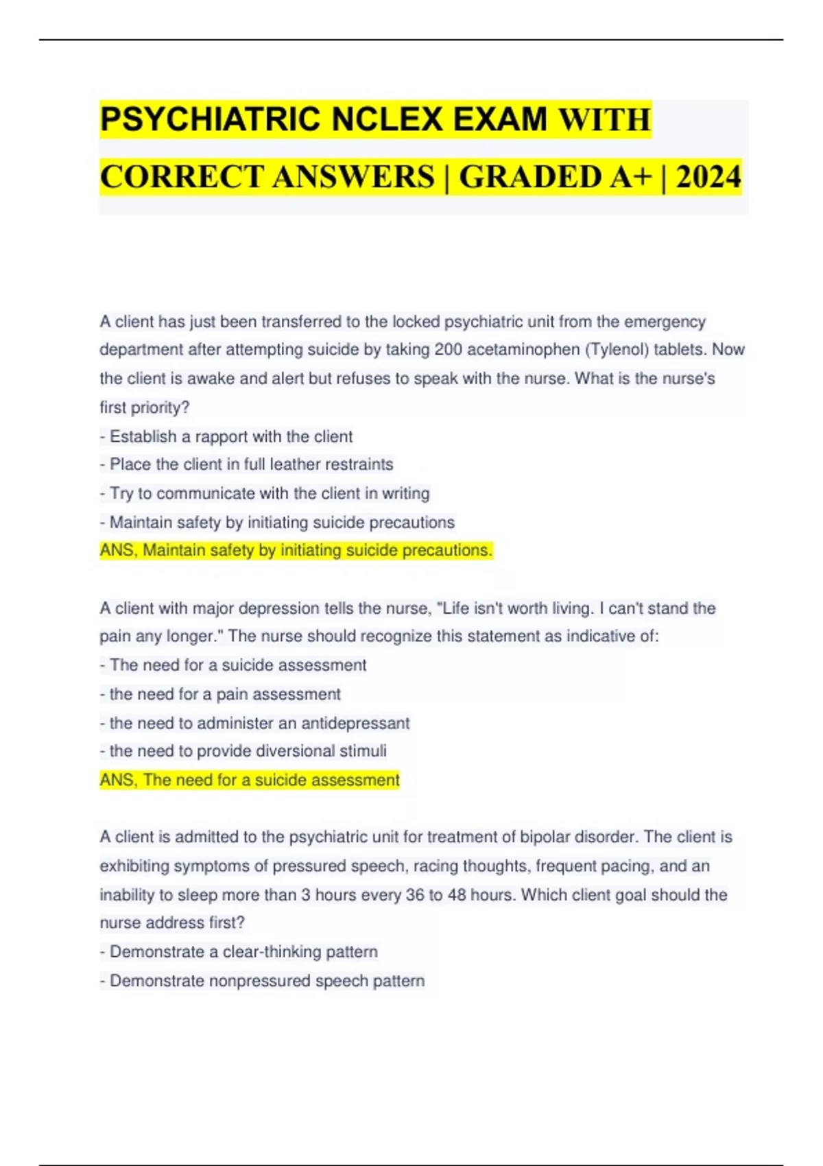 PSYCHIATRIC NCLEX EXAM WITH CORRECT ANSWERS | GRADED A+ | 2024 A client has just been transferred to the locked psychiatric unit from the emergency department after attempting suicide by taking 200 acetaminophen (Tylenol) tablets. Now the client is awake and alert but refuses to speak with the nurse. What is the nurse's first priority? - Establish a rapport with the client - Place the client in full leather restraints - Try to communicate with the client in writing - Maintain safety by initiating suicide precautions ANS, Maintain safety by initiating suicide precautions. A client with major depression tells the nurse, "Life isn't worth living. I can't stand the pain any longer." The nurse should recognize this statement as indicative of: - The need for a suicide assessment - the need for a pain assessment - the need to administer an antidepressant - the need to provide diversional stimuli ANS, The need for a suicide assessment A client is admitted to the psychiatric unit for treatment of bipolar disorder. The client is exhibiting symptoms of pressured speech, racing thoughts, frequent pacing, and an inability to sleep more than 3 hours every 36 to 48 hours. Which client goal should the nurse address first? - Demonstrate a clear-thinking pattern - Demonstrate nonpressured speech patter
