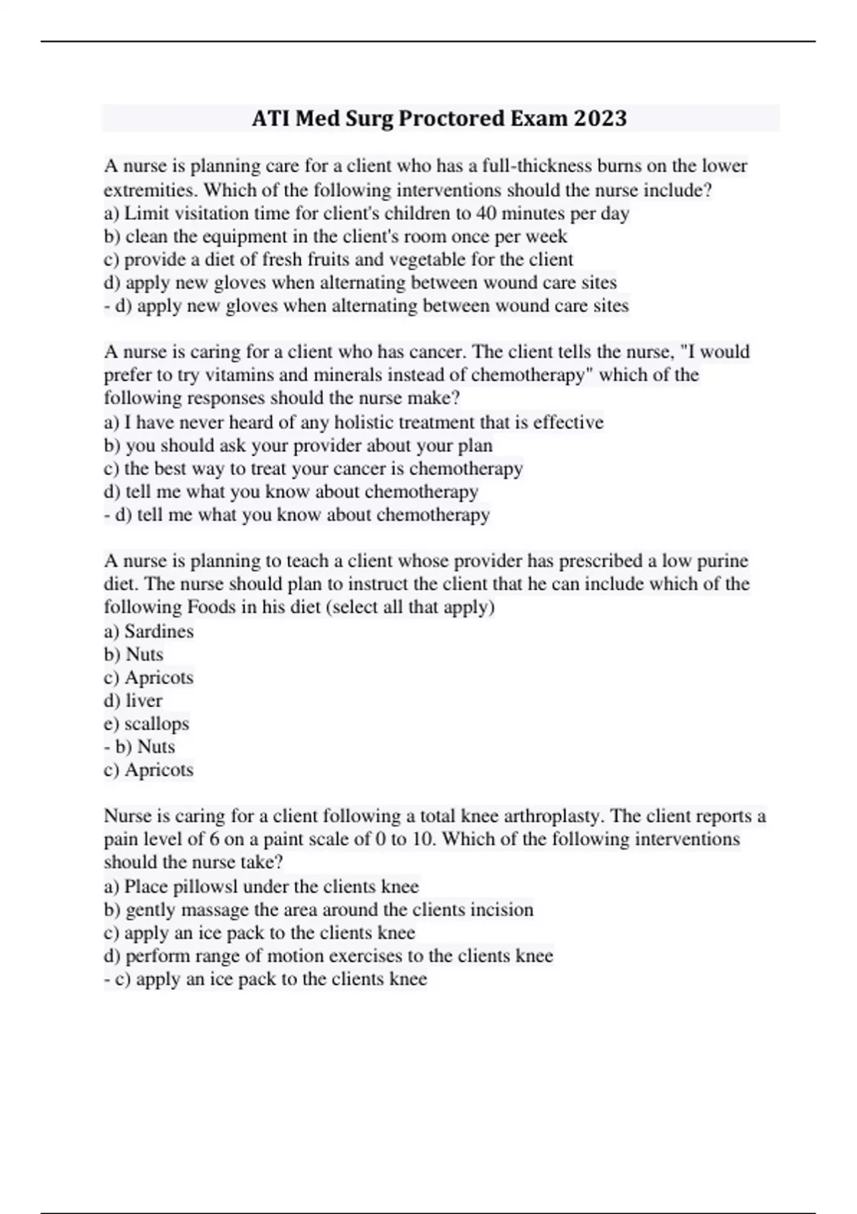 A nurse is planning care for a client who has a full-thickness burns on the lower extremities. Which of the following interventions should the nurse include? a) Limit visitation time for client's children to 40 minutes per day b) clean the equipment in the client's room once per week c) provide a diet of fresh fruits and vegetable for the client d) apply new gloves when alternating between wound care sites - d) apply new gloves when alternating between wound care sites A nurse is caring for a client who has cancer. The client tells the nurse, "I would prefer to try vitamins and minerals instead of chemotherapy" which of the following responses should the nurse make? a) I have never heard of any holistic treatment that is effective b) you should ask your provider about your plan c) the best way to treat your cancer is chemotherapy d) tell me what you know about chemotherapy - d) tell me what you know about chemotherapy A nurse is planning to teach a client whose provider has prescribed a low purine diet. The nurse should plan to instruct the client that he can include which of the following Foods in his diet (select all that apply) a) Sardines b) Nuts c) Apricots d) liver e) scallops - b) Nuts c) Apricots Nurse is caring for a client following a total knee arthroplasty. The client reports a pain level of 6 on a paint scale of 0 to 10. Which of the following interventions should the nurse take? a) Place pillowsl under the clients knee b) gently massage the area around the clients incision c) apply an ice pack to the clients knee d) perform range of motion exercises to the clients knee - c) apply an ice pack to the clients kneeA nurse is caring for a client who has lower extremity fracture and a prescription for crutches. Which of the following client statements indicates that the client is adapting to their role change? a) I will need to have my partner take over shopping for groceries and cooking the meals for us b) Its going to be difficult to tell my parents I can't take them to their appointments anymore c) I feel bad that I have to ask my partner to keep the house clean d) These crutches will make it impossible to care for my child - a) I will need to have my partner take over shopping for groceries and cooking the meals for us A nurse is assessing a client who is preoperative and reports an allergy to bananas. The nurse should recognize that the client is at risk for an allergic cross-reactivity to which of the following substances? a) adhesive tape b) Latex c) Anesthetics d) povidone iodine - b) Latex A nurse on a medical unit is planning care for a group of clients. Which of the following clients should the nurse attend to First? a) A client who has chronic obstructive pulmonary disease in oxygen saturation of 89% b) a client who has left-sided paralysis and slurred speech from a prior stroke c) a client who has thrombocytopenia and reports a nosebleed d) a client who has multiple sclerosis and reports Ataxia and vertigo - c) a client who has thrombocytopenia and reports a nosebleed A nurse is monitoring a client who is receiving two units packed RBC's. Which of the following manifestation indicates a hemolytic transfusion reaction? a) back pain b) Hypertension c) Chills d) bradycardia - a) back pain A nurse is teaching a client who has diabetes mellitus about foot care. Which of the following instruction should the nurse include?a) Use a heating pad to keep your feet warm at night b) wear loose-fitting slippers around the house c) where cotton rather than nylon socks d) wash your face twice per day with antibacterial soap and hot water - c) where cotton rather than nylon socks A nurse is providing teaching to a client who has a deep vein thrombosis (DVT) . Which of the following findings should the nurse identify as a risk factor for the development of the DVTs? a) NSAID use b) hypertension c) oral contraceptive use d) cirrhosis - c) oral contraceptive use A nurse is caring for a client who has a sealed radiation implant. Which of the following actions should the nurse take? a) Remove soiled linens from the room after each change b) Give the dosimeter badge to the oncoming nurse at the end of the shift c) Apply a second pair of gloves before touching the client's implant if it dislodges d) Limit family member visits to 30 min per day - d) Limit family member visits to 30 min per day A nurse is providing teaching to a client and his partner about performing peritoneal dialysis at home. When discussing peritonitis, which of the following manifestations should the nurse identify as the earliest indication of this complication? a) Generalized abdominal pain b) Cloudy effluent c) Increased heart rate d) Fever - d) Fever A nurse is caring for a client who is receiving a blood transfusion. The nurse observes that the client has bounding peripheral pulses, hypertension, and distended jugular veins. The nurse should anticipate administering which of the following prescribed medications? a) Pantoprazole b) Acetaminophen c) Furosemided) Diphenhydramine - c) Furosemide A nurse is planning care for a client who has upper gastrointestinal bleeding due to a peptic ulcer. Which of the following actions should the nurse plan to take? a) Provide ketorolac for abdominal pain b) Administer nitroprusside IV based on the client's weight c) Insert a large bore nasogastric tube d) Ensure that the client has a 22- gauge iv line in place - c) Insert a large bore nasogastric tube A nurse is caring for a client who has bladder cancer and a WBC count of 900/mm3. Which of the following actions should the nurse take? a) Instruct client to avoid eating raw fruit b) Move the client to a negative pressure room c) Use contact isolation while providing care d) Apply pressure to venipuncture sites for 10 min - a) Instruct client to avoid eating raw fruit A nurse is caring for a patient who has hypotension, cool and clammy skin, tachycardia and tachypnea. Which of the following positions should the nurse place the cli