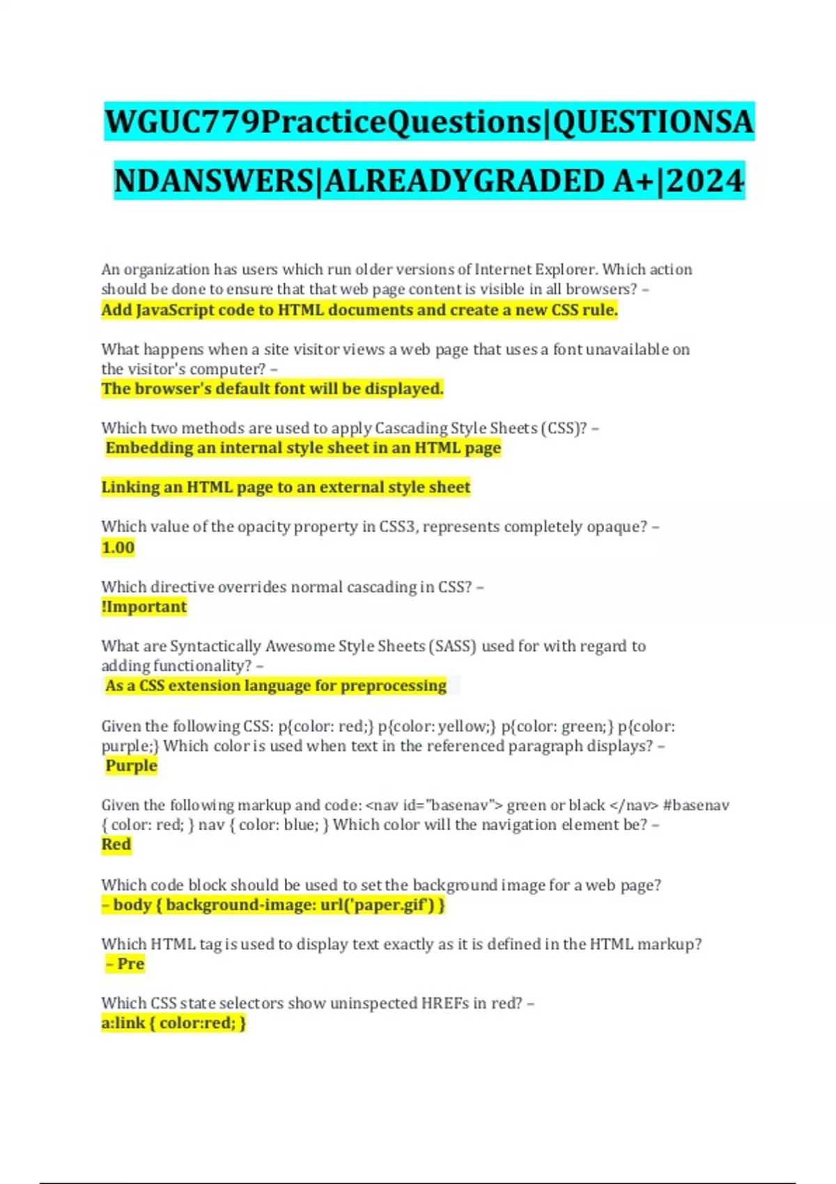 WGUC779PracticeQuestions|QUESTIONSA NDANSWERS|ALREADYGRADED A+|2024 An organization has users which run older versions of Internet Explorer. Which action should be done to ensure that that web page content is visible in all browsers? – Add JavaScript code to HTML documents and create a new CSS rule. What happens when a site visitor views a web page that uses a font unavailable on the visitor's computer? – The browser's default font will be displayed. Which two methods are used to apply Cascading Style Sheets (CSS)? – Embedding an internal style sheet in an HTML page Linking an HTML page to an external style sheet Which value of the opacity property in CSS3, represents completely opaque? – 1.00 Which directive overrides normal cascading in CSS? – !Important What are Syntactically Awesome Style Sheets (SASS) used for with regard to adding functionality? – As a CSS extension language for preprocessing Given the following CSS: p{color: red;} p{color: yellow;} p{color: green;} p{color: purple;} Which color is used when text in the referenced paragraph displays? – Purple Given the following markup and code: nav id="basenav" green or black /nav #basenav { color: red; } nav { color: blue; } Which color will the navigation element be? – Red Which code block should be used to set the background image for a web page? – body { background-image: url('') } Which HTML tag is used to display text exactly as it is defined in the HTML markup? – Pre Which CSS state selectors show uninspected HREFs in red?