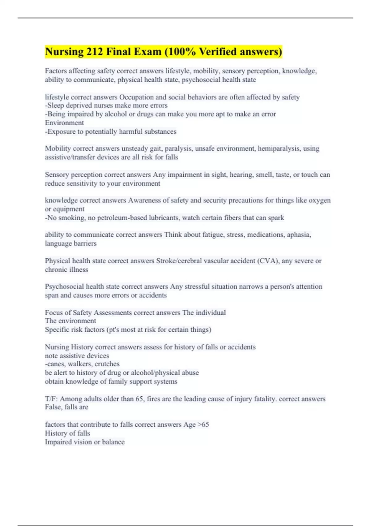 Factors affecting safety correct answers lifestyle, mobility, sensory perception, knowledge, ability to communicate, physical health state, psychosocial health state lifestyle correct answers Occupation and social behaviors are often affected by safety -Sleep deprived nurses make more errors -Being impaired by alcohol or drugs can make you more apt to make an error Environment -Exposure to potentially harmful substances Mobility correct answers unsteady gait, paralysis, unsafe environment, hemiparalysis, using assistive/transfer devices are all risk for falls Sensory perception correct answers Any impairment in sight, hearing, smell, taste, or touch can reduce sensitivity to your environment knowledge correct answers Awareness of safety and security precautions for things like oxygen or equipment -No smoking, no petroleum-based lubricants, watch certain fibers that can spark ability to communicate correct answers Think about fatigue, stress, medications, aphasia, language barriers Physical health state correct answers Stroke/cerebral vascular accident (CVA), any severe or chronic illness Psychosocial health state correct answers Any stressful situation narrows a person's attention span and causes more errors or accidents Focus of Safety Assessments correct answers The individual The environment Specific risk factors (pt's most at risk for certain things) Nursing History correct answers assess for history of falls or accidents note assistive devices -canes, walkers, crutches be alert to history of drug or alcohol/physical abuse obtain knowledge of family support systems T/F: Among adults older than 65, fires are the leading cause of injury fatality. correct answers False, falls are factors that contribute to falls correct answers Age 65 History of falls Impaired vision or balance