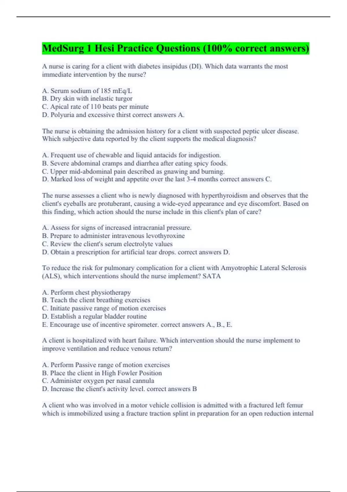 A nurse is caring for a client with diabetes insipidus (DI). Which data warrants the most immediate intervention by the nurse? A. Serum sodium of 185 mEq/L B. Dry skin with inelastic turgor C. Apical rate of 110 beats per minute D. Polyuria and excessive thirst correct answers A. The nurse is obtaining the admission history for a client with suspected peptic ulcer disease. Which subjective data reported by the client supports the medical diagnosis? A. Frequent use of chewable and liquid antacids for indigestion. B. Severe abdominal cramps and diarrhea after eating spicy foods. C. Upper mid-abdominal pain described as gnawing and burning. D. Marked loss of weight and appetite over the last 3-4 months correct answers C. The nurse assesses a client who is newly diagnosed with hyperthyroidism and observes that the client's eyeballs are protuberant, causing a wide-eyed appearance and eye discomfort. Based on this finding, which action should the nurse include in this client's plan of care? A. Assess for signs of increased intracranial pressure. B. Prepare to administer intravenous levothyroxine C. Review the client's serum electrolyte values D. Obtain a prescription for artificial tear drops. correct answers D. To reduce the risk for pulmonary complication for a client with Amyotrophic Lateral Sclerosis (ALS), which interventions should the nurse implement? SATA A. Perform chest physiotherapy B. Teach the client breathing exercises C. Initiate passive range of motion exercises D. Establish a regular bladder routine E. Encourage use of incentive spirometer. correct answers A., B., E. A client is hospitalized with heart failure. Which intervention should the nurse implement to improve ventilation and reduce venous return? A. Perform Passive range of motion exercises B. Place the client in High Fowler Position C. Administer oxygen per nasal cannula D. Increase the client's activity level. correct answers B A client who was involved in a motor vehicle collision is admitted with a fractured left femur which is immobilized using a fracture traction splint in preparation for an open reduction internal