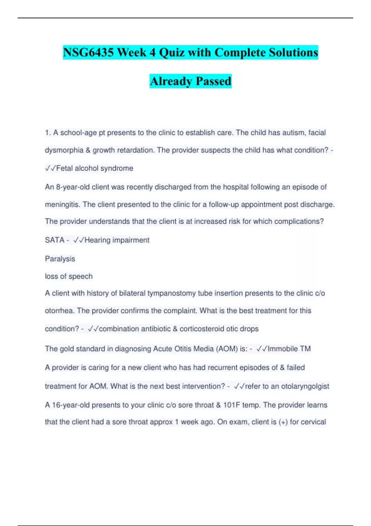 NSG6435 Week 4 Quiz with Complete Solutions Already Passed 1. A school-age pt presents to the clinic to establish care. The child has autism, facial dysmorphia & growth retardation. The provider suspects the child has what condition? - Fetal alcohol syndrome An 8-year-old client was recently discharged from the hospital following an episode of meningitis. The client presented to the clinic for a follow-up appointment post discharge. The provider understands that the client is at increased risk for which complications? SATA - Hearing impairment