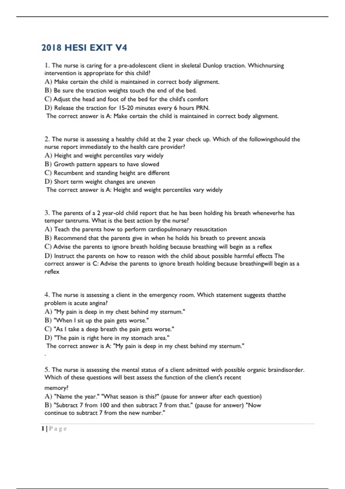 Hesi Exit V4 COMPLETE 160 QUESTION AND ANSWERS1. The nurse is caring for a pre-adolescent client in skeletal Dunlop traction. Which nursing intervention is appropriate for this child? A) Make certain the child is maintained in correct body alignment. B) Be sure the traction weights touch the end of the bed. C) Adjust the head and foot of the bed for the child's comfort D) Release the traction for 15-20 minutes every 6 hours PRN. The correct answer is A: Make certain the child is maintained in correct body alignment. 2. The nurse is assessing a healthy child at the 2 year check up. Which of the following should the nurse report immediately to the health care provider? A) Height and weight percentiles vary widely B) Growth pattern appears to have slowed C) Recumbent and standing height are different D) Short term weight changes are uneven The correct answer is A: Height and weight percentiles vary widely 3. The parents of a 2 year-old child report that he has been holding his breath whenever he has temper tantrums. What is the best action by the nurse? A) Teach the parents how to perform cardiopulmonary resuscitation B) Recommend that the parents give in when he holds his breath to prevent anoxia C) Advise the parents to ignore breath holding because breathing will begin as a reflex D) Instruct the parents on how to reason with the child about possible harmful effects The correct answer is C: Advise the parents to ignore breath holding because breathing will begin as a reflex 4. The nurse is assessing a client in the emergency room. Which statement suggests that the problem is acute angina? A) "My pain is deep in my chest behind my sternum." B) "When I sit up the pain gets worse." C) "As I take a deep breath the pain gets worse." D) "The pain is right here in my stomach area." The correct answer is A: "My pain is deep in my chest behind my sternum." . 5. The nurse is assessing the mental status of a client admitted with possible organic brain disorder. Which of these questions will best assess the function of the client's recent memory? A) "Name the year." "What season is this?" (pause for answer after each question) B) "Subtract 7 from 100 and then subtract 7 from that." (pause for answer) "Now continue to subtract 7 from the new number." 1 | P a g eC) "I am going to say the names of three things and I want you to repeat them after me: blue, ball, pen." D) "What is this on my wrist?" (point to your watch) Then ask, "What is the purpose of it?" The correct answer is C: "I am going to say the names of three things and I want you to repeat them after me: blue, ball, pen." 6. In planning care for a 6 month-old infant, what must the nurse provide to assist in the development of trust? A) Food B) Warmth C) Security D) Comfort The correct answer is C: Security 7. A nurse has just received a medication order which is not legible. Which statement best reflects assertive communication? A) "I cannot give this medication as it is written. I have no idea of what you mean." B) "Would you please clarify what you have written so I am sure I am reading it correctly?" C) "I am having difficulty reading your handwriting. It would save me time if you would be more careful." D) "Please print in the future so I do not have to spend extra time attempting to read your writing." The correct answer is B) "Would you please clarify what you have written so I am sure I am reading it correctly?" 8. What is the most important consideration when teaching parents how to reduce risks in the home? A) Age and knowledge level of the parents B) Proximity to emergency services C) Number of children in the home D) Age of children in the home The correct answer is D: Age of children in the home 9. A 35 year-old client with sickle cell crisis is talking on the telephone but stops as the nurse enters the room to request something for pain. The nurse should A) Administer a placebo B) Encourage increased fluid intake C) Administer the prescribed analgesia D) Recommend relaxation exercises for pain control The correct answer is C: Administer the prescribed analgesia 10. While caring for a toddler with croup, which initial sign of croup requires the nurse's immediate attention? 2 | P a g eA) Respiratory rate of 42 B) Lethargy for the past hour C) Apical pulse of 54 D) Coughing up copious secretions The correct answer is A: Respiratory rate of 30 11. A client is admitted with low T3 and T4 levels and an elevated TSH level. On initial assessment, the nurse would anticipate which of the following assessment findings? A) Lethargy B) Heat intolerance C) Diarrhea D) Skin eruptions The correct answer is A: Lethargy 12. The emergency room nurse admits a child who experienced a seizure at school. The father comments that this is the first occurrence, and denies any family history of epilepsy. What is the best response by the nurse? A) "Do not worry. Epilepsy can be treated with medications." B) "The seizure may or may not mean your child has epilepsy." C) "Since this was the first convulsion, it may not happen again." D) "Long term treatment will prevent future seizures." The correct answer is B: "The seizure may or may not mean your child has epilepsy." 13. Alcohol and drug abuse impairs judgment and increases risk taking behavior. What nursing diagnosis best applies? A) Risk for injury B) Risk for knowledge deficit C) Altered thought process D) Disturbance in self-esteem The correct answer is A: Risk for injury 14. The nurse is caring for a 10 month-old infant who is has oxygen via mask. It is important for the nurse to maintain patency of which of these areas? A) Mouth B) Nasal passages C) Back of throat D) Bronchials The correct answer is B: Nasal passages 15. The nurse is providing instructions for a client with pneumonia. What is the most important information to convey to the client? 3 | P a g eA) "Take at least 2 weeks off from work." B) "You will need another chest x-ray in 6 weeks." C) "Take your temperature every day." D) "Complete 