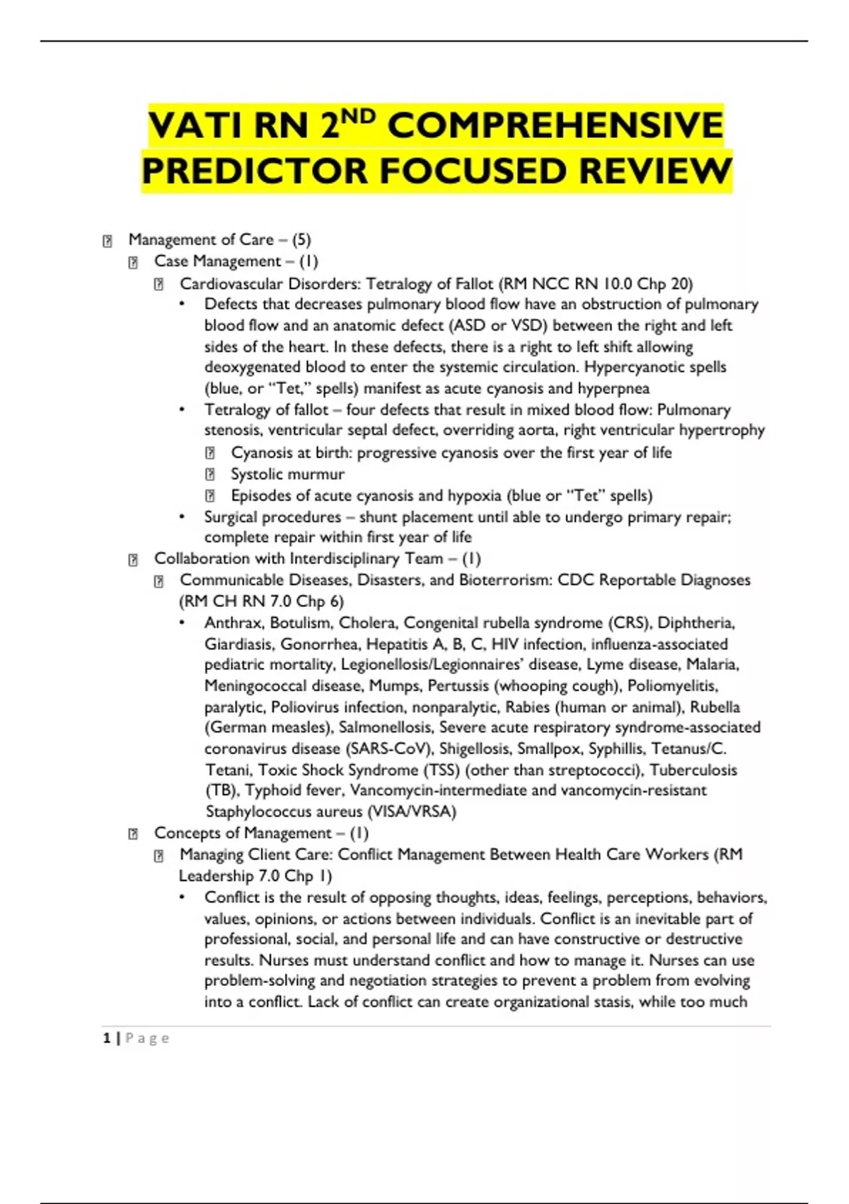 VATI RN 2ND COMPREHENSIVE PREDICTOR FOCUSED REVIEWManagement of Care – (5) Case Management – (1) Cardiovascular Disorders: Tetralogy of Fallot (RM NCC RN 10.0 Chp 20) • Defects that decreases pulmonary blood flow have an obstruction of pulmonary blood flow and an anatomic defect (ASD or VSD) between the right and left sides of the heart. In these defects, there is a right to left shift allowing deoxygenated blood to enter the systemic circulation. Hypercyanotic spells (blue, or “Tet,” spells) manifest as acute cyanosis and hyperpnea • Tetralogy of fallot – four defects that result in mixed blood flow: Pulmonary stenosis, ventricular septal defect, overriding aorta, right ventricular hypertrophy Cyanosis at birth: progressive cyanosis over the first year of life Systolic murmur Episodes of acute cyanosis and hypoxia (blue or “Tet” spells) • Surgical procedures – shunt placement until able to undergo primary repair; complete repair within first year of life Collaboration with Interdisciplinary Team – (1) Communicable Diseases, Disasters, and Bioterrorism: CDC Reportable Diagnoses (RM CH RN 7.0 Chp 6) • Anthrax, Botulism, Cholera, Congenital rubella syndrome (CRS), Diphtheria, Giardiasis, Gonorrhea, Hepatitis A, B, C, HIV infection, influenza-associated pediatric mortality, Legionellosis/Legionnaires’ disease, Lyme disease, Malaria, Meningococcal disease, Mumps, Pertussis (whooping cough), Poliomyelitis, paralytic, Poliovirus infection, nonparalytic, Rabies (human or animal), Rubella (German measles), Salmonellosis, Severe acute respiratory syndrome-associated coronavirus disease (SARS-CoV), Shigellosis, Smallpox, Syphillis, Tetanus/C. Tetani, Toxic Shock Syndrome (TSS) (other than streptococci), Tuberculosis (TB), Typhoid fever, Vancomycin-intermediate and vancomycin-resistant Staphylococcus aureus (VISA/VRSA) Concepts of Management – (1) Managing Client Care: Conflict Management Between Health Care Workers (RM Leadership 7.0 Chp 1) • Conflict is the result of opposing thoughts, ideas, feelings, perceptions, behaviors, values, opinions, or actions between individuals. Conflict is an inevitable part of professional, social, and personal life and can have constructive or destructive results. Nurses must understand conflict and how to manage it. Nurses can use problem-solving and negotiation strategies to prevent a problem from evolving into a conflict. Lack of conflict can create organizational stasis, while too much 1 | P a g econflict can be demoralizing, produce anxiety, and contribute to burnout. Conflict can disrupt working relationships and create a stressful atmosphere. If conflict exists to the level that productivity and quality of care are compromised, the unit manager must attempt to identify the origin of the conflict and attempt to resolve it. Continuity of Care – (1) Information Technology: Change-of-Shift Report (RM FUND 9.0 Chp 5) • Nurses give this report at the conclusion of each shift ot the nurse assuming responsibility for the clients. Formats include face to face, audiotaping, or presentation during walking rounds in each client’s room (unless the client has a roommate or visitors are present). An effective report should: include significant objective information about the client’s health problems, proceed in a logical sequence, include no gossip or personal opinion, and relate recent changes in medications, treatments, procedures, and the discharge plan. Establishing Priorities – (1) Managing Client Care: Prioritizing Care of Postoperative Clients (RM Leadership 7.0 Chp 1) • Prioritize systemic before local (“life before limb”) • Prioritize acute (less opportunity for physical adaptation) before chronic (greater opportunity for physical adaptation) • Prioritize actual problems before potential future problems • Listen carefully to clients and don’t assume • Recognize and respond to trends vs. transient findings • Recognize indications of medical emergencies and complications vs. expected findings • Apply clinical knowledge to procedural standards to determine the priority actions Safety and Infection Control – (8) Accident/Error/Injury Prevention – (1) Seizures: Maintaining Seizure Precautions (RM NCC RN 10.0 Chp 13) • Maintain seizure precautions, including placing the bed in the lowest position and padding the side rails to prevent future injury. Emergency Response Plan – (1) Client Safety: Priority Action for Fire (RM FUND 9.0 Chp 12) • R: rescue and protect clients in close proximity to the fire by moving them to a safer location. Clients who are ambulatory may walk independently in a safe location • A: alarm: activate the facility’s alarm system and then report the fire’s details and location • C: contain/confine the fire by closing doors and windows and turning off any sources of oxygen and any electrical devices. Ventilate clients who are on life support with a bag valve mask • E: extinguish the fire is possible using the appropriate fire extinguisherHandling Hazardous and Infectious Materials – (1) Cancer Treatment Options: Implanted Internal Radiation Device (RM AMS RN 10.0 Chp 91) • Brachytherapy describes internal radiation that is placed close to the target tissue. This is done via placement in a body orifice (vagina) or body cavity (abdomen) or delivered via IV such as with radionuclide iodine, which is absorbed by the thyroid. Brachytherapy provides radiation to the tumor and a limited amount to surrounding normal tissues. Waste products are radioactive until the isotope has been completely eliminated from the body. Waste products should not be touched by anyone. Nursing considerations: Place the client in a private room away from other clients when possible. Keep door closed as much as possible. Place a sign on the door warning of the radiation source. Wear a dosimeter film badge that records personal amount of radiation exposure. Limit visitors to 30-min visits, and ha