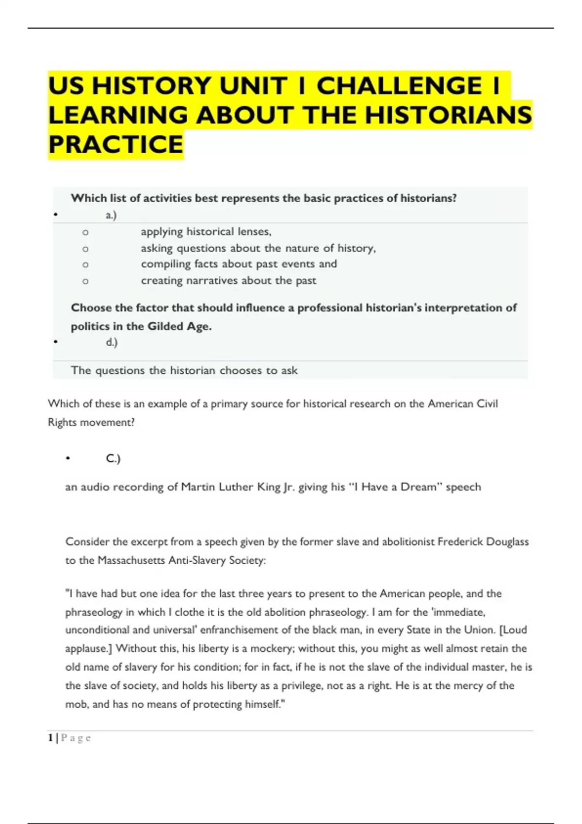 US HISTORY UNIT 1 CHALLENGE 1 LEARNING ABOUT THE HISTORIANS PRACTICE