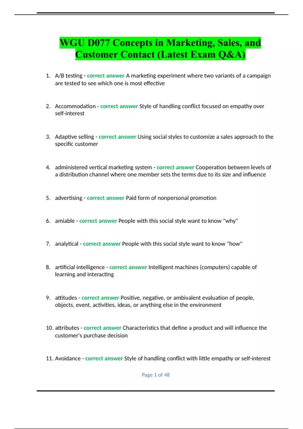 WGU D077 Concepts in Marketing, Sales, and Customer Contact (Latest Exam Q&A).WGU D077 Concepts in Marketing, Sales, and Customer Contact (Latest Exam Q&A).